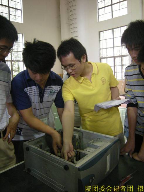 机械制图趣味比赛的题目是根据轴侧图画出三视图,时间为一个小时。每个同都抓紧时间充分发挥自己平时所学的知识。一个小时转眼就快到了,旁边的同学看着时间都快到了,有的同学还没画完,在旁边看的同学也只能替他们干着急。时间到了,参赛人员都画的差不多了。经过蔡长运老师的精心挑选,评出一等奖李希恩、二等奖黄灿辉、三等奖陈吉祥。电脑主机组装分成八组,大家挣分夺秒的非常有默契的完成,由陈志伟老师评出一等奖吴步春等四位同学;二等奖许鸿毅等同学;三等奖张艺燕等人。