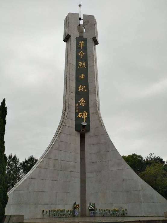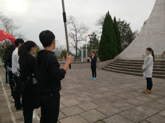 沿着九峰山蜿蜒的小路,到达纪念碑后,由郑理函同学主持瞻仰烈士纪念碑的仪式。首先开始的是唱国歌,高亢洪亮的歌声响起,仿佛置身在那个战火纷飞的年代。唱完国歌后大家纷纷敬献自己手中的鲜花,并在纪念碑前鞠躬、默哀。最后叶文美老师发表讲话并带领大家瞻仰九峰山革命英雄纪念碑。