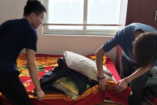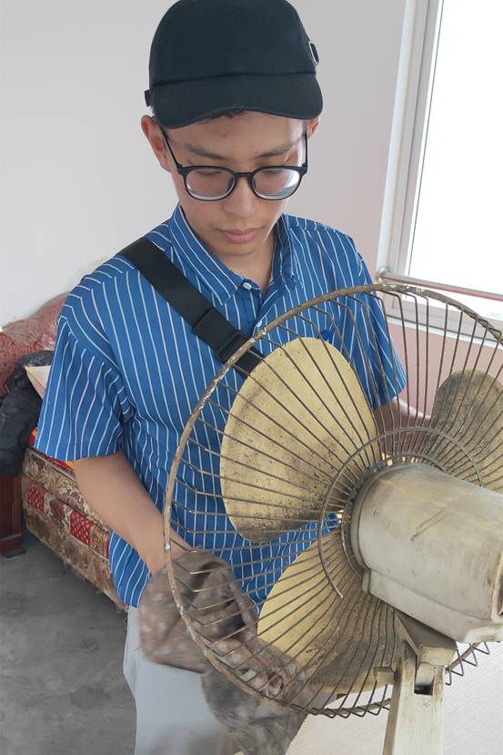 薛爷爷常年行动不便,依靠着轮椅生活,能够见到同学们感到非常高兴。同学们依次和爷爷打招呼并介绍自己之后,按照惯例,新加入的同学要给薛爷爷唱歌。虽然同学们唱得有些五音不全,但是薛爷爷依然听得很高兴。志愿者们一队陪爷爷聊天,另一队分工合作,帮忙擦窗户,扫地拖地、清洁风扇、为爷爷铺床,一样都不落下。同学们努力地干着活,即使脸上流着汗水,却一点都不觉得累,能帮助到薛爷爷心里都感到十分开心。