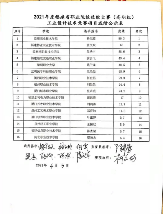由福建省教育厅主办的“2021年福建省职业院校技能大赛(高职组)工业设计技术”于2021年4月1日至3日在漳州职业技术学院举行。本次比赛参赛的队员为机制1902班翁义斌同学。参赛队员在陈庆红、刘晋斌老师的精心指导下,不畏强敌,沉着应战,战胜了众多强队,获省级一等奖。