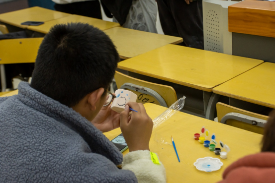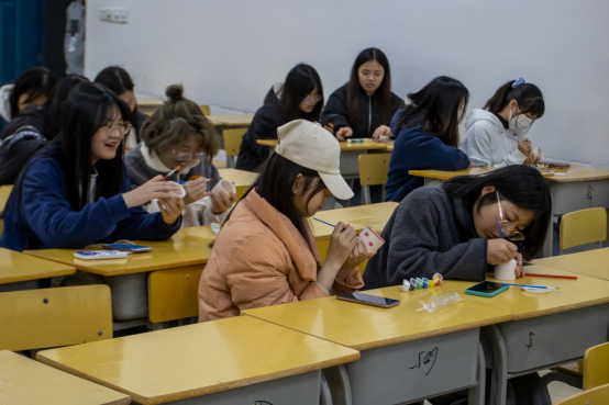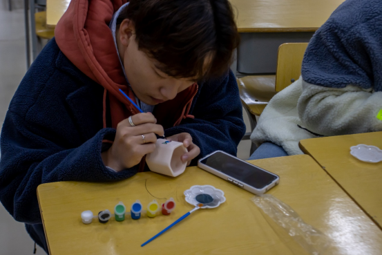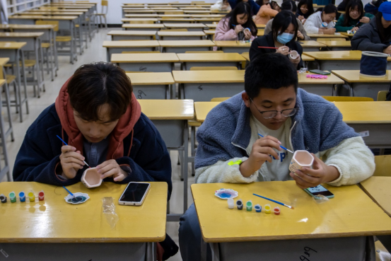 同学们在彩绘的过程中小心翼翼着手于颜料的调试,不同的色彩在画板上发生碰撞。在淡雅的素胚上,描绘出独属自己的个性符号。