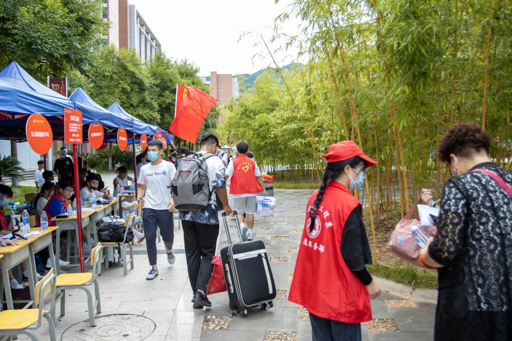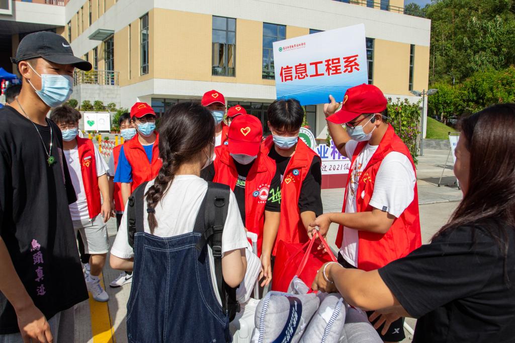 迎新现场,从报名处到注册组,再到寝室,处处看得到身穿红色马甲的志愿者,他们热情接待新生,忙碌的身影穿梭在人海。新生班级助导也耐心地给新生们介绍学校的基本情况,分享了自己的大学生活经验,为新生融入新环境提供了帮助。