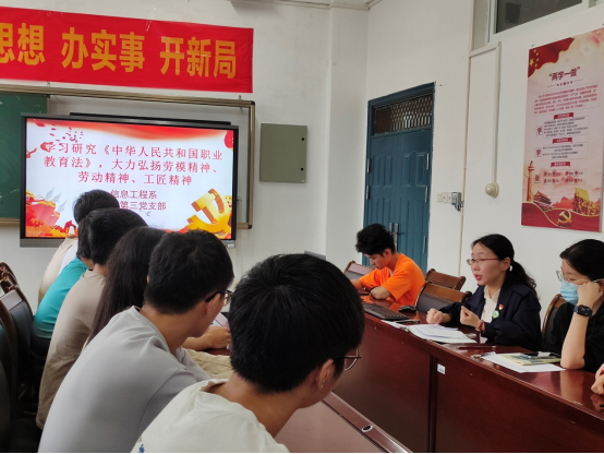 为深入贯彻学习新修订的《中华人民共和国职业教育法》,调动支部学生党员、入党积极分子参与技能大赛的积极性,大力弘扬劳模精神、劳动精神、工匠精神,信息工程系学生第三党支部于5月23日在实训三408教室召开学习研讨交流会。本次学习会由信息工程系学生第三党支部书记刘克芹老师主持,支部师生党员、入党积极分子参加这次学习会。