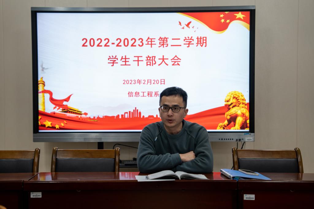 为加强学院学生干部队伍新学期能力建设,推进新学期学生工作有序开展,认真贯彻落实学院”两整治”工作,2月20日晚上7:00,信息工程系在实训三408会议室召开2022-2023学年第二学期学生干部大会,本次会议由系学生科科长兼团总支书记吴文杰主持,系两委会全体学生干部参会。