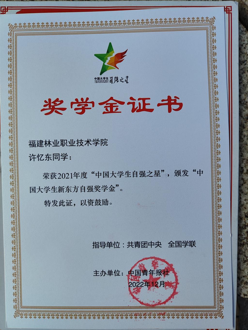 许忆东,男,中共预备党员,福建漳州人,现为计算机应用技术2003班学生,在校期间,担任2021-2022学年院学生会副主席、班级学习委员等职务。在校期间,他积极向上,乐于奉献,时刻发挥着模范带头作用,荣获中华人民共和国教育部2021-2022学年度国家奖学金、2021年度中国大学生自强之星荣誉称号、连续两学年荣获学院一等奖学金、“三好学生”等荣誉称号。