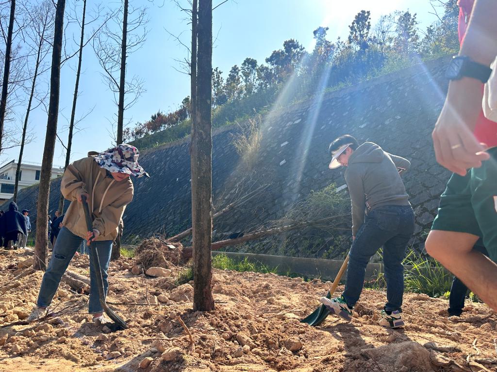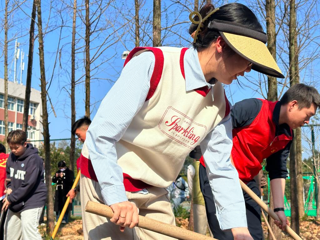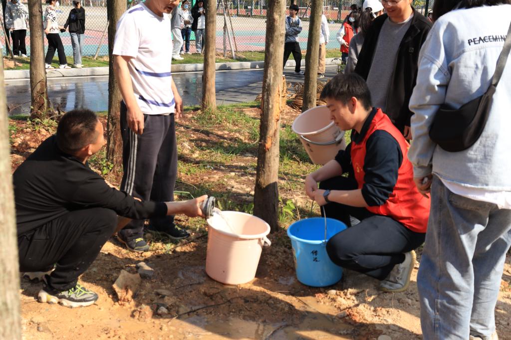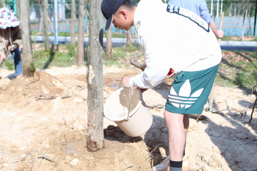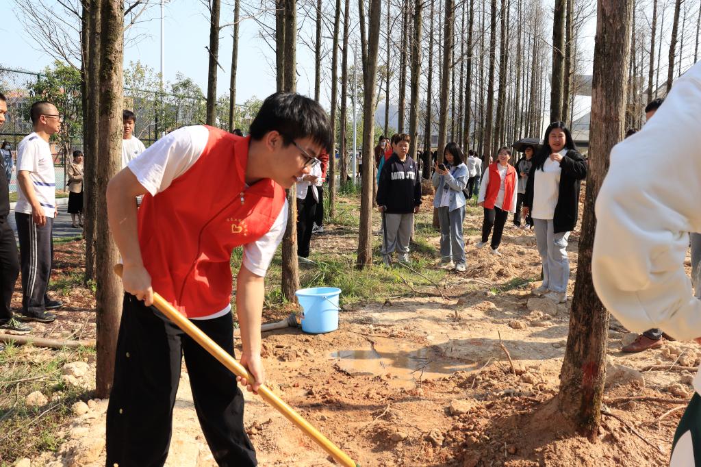 在信工楼旁水杉林,师生志愿者们齐心协力,挥锹挖坑、回填熟土、夯实土层、培土浇水,分工井然有序,干劲十足。忙碌过后,一株株苗木错落有致、迎风挺立,校道呈现一片绿意盎然的景象,充分展现了系部师生“奉献、友爱、互助、进步”的志愿服务精神。