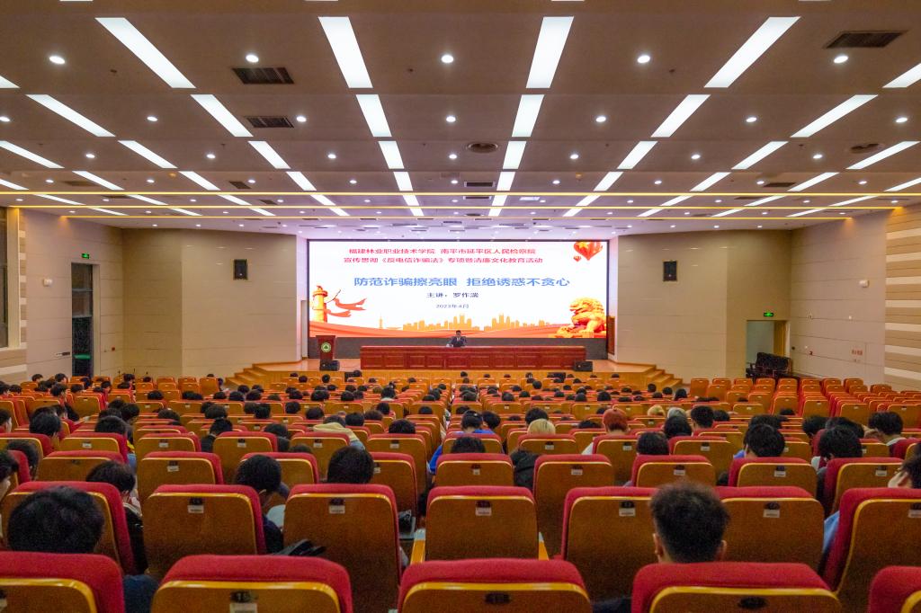 为深化平安校园建设,提高学生反诈防骗意识和应变能力,切实维护学生合法权益,培育正确的价值观念和高尚的道德情操,4月6日,信息工程系与建筑工程系联合南平市延平区人民检察院在江南学术报告厅开展宣传贯彻《反电信诈骗法》专项暨清廉文化教育活动,本次讲座诚邀南平市延平区人民检察院检察官罗作湍担任主讲,信息工程系与建筑工程系辅导员、22级学生参与讲座。