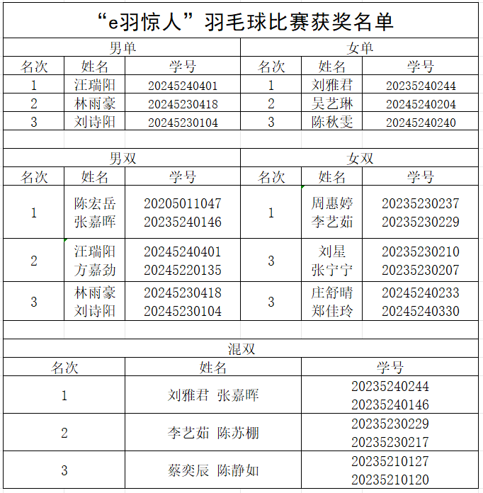 为丰富校园文体生活,增强学生身体素质,信息工程系 "e 羽惊人" 羽毛球赛于近日在体育馆圆满落幕。本次赛事设置混合团体赛与男单、女单、混双等单项赛,吸引全系众多选手参赛,通过竞技体育展现青年学子蓬勃向上的精神风貌。