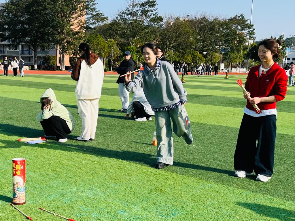 “投壶竞技・百步穿杨”项目中,参赛小组的两位同学站在指定距离外,专注地投出手中的箭矢。每一次投出,都承载着小组的希望,大家屏气凝神,期待着箭矢能精准落入壶中。赛场上,欢呼声与叹息声交织,同学们为每一次精彩的投中欢呼,也为稍有偏差的尝试感到惋惜。