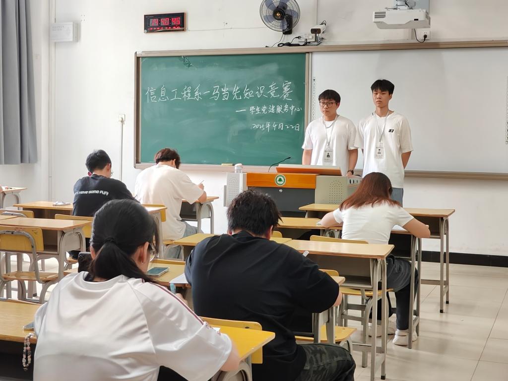 为深入学习贯彻习近平新时代中国特色社会主义思想,切实将党的创新理论转化为青年学生的思想自觉和行动自觉,2025年4月22日下午2:30,信息工程系在江南校区教学楼307、309教室举办 2025 年 “一马当先” 知识竞赛,参赛学生们以饱满的热情踊跃参与,在理论比拼中展现青春风采。