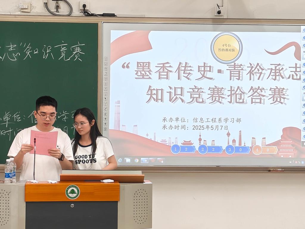为深化 “以学促思、以思促行” 教育理念,营造勤学善思的校园文化氛围,5月7日晚19:00,由信息工程系团总支主办、学习部承办的“墨香传史,青衿承志”知识竞赛在教学楼711顺利举办。本次竞赛以党史、团史和校史知识竞赛为主,吸引了来自全系数十名同学踊跃报名,现场座无虚席,气氛热烈,尽显信工学子的知识底蕴与竞技热情。