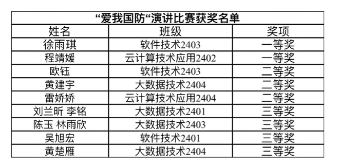 本次“爱我国防” 主题演讲比赛以青春之名搭建起展现自我的广阔舞台。选手们以铿锵有力的话语、真挚炽热的情感,从不同角度诠释新时代青年对国防事业的理解与担当,现场掌声雷动,爱国情怀在共鸣中不断升华。这场比赛在校园内掀起了关心国防、热爱国防、建设国防、保卫国防的热潮。信息工程系表示,未来将以此次比赛为契机,持续开展多样化国防教育活动,通过体验与理论学习相结合的方式,引导青年学子将拳拳爱国之心转化为脚踏实地的报国之行,让青春在国防事业中绽放绚丽之花。