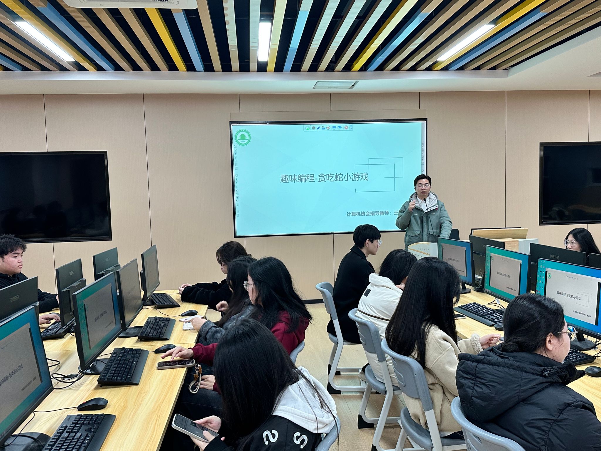活动创新采用“趣味讲解+实操练习”结合模式,以经典“贪吃蛇”小游戏为核心载体,让编程学习更具吸引力。开场环节,王运安老师通过电脑广播功能开展教学,将复杂编程原理化繁为简:拆解蛇的移动机制、食物随机生成逻辑;讲解得分系统搭建与碰撞检测设置;演示Python编程基础语法与图形界面开发技巧。生动易懂的讲解扫清了学习障碍,让同学们快速掌握游戏编程的核心思路。