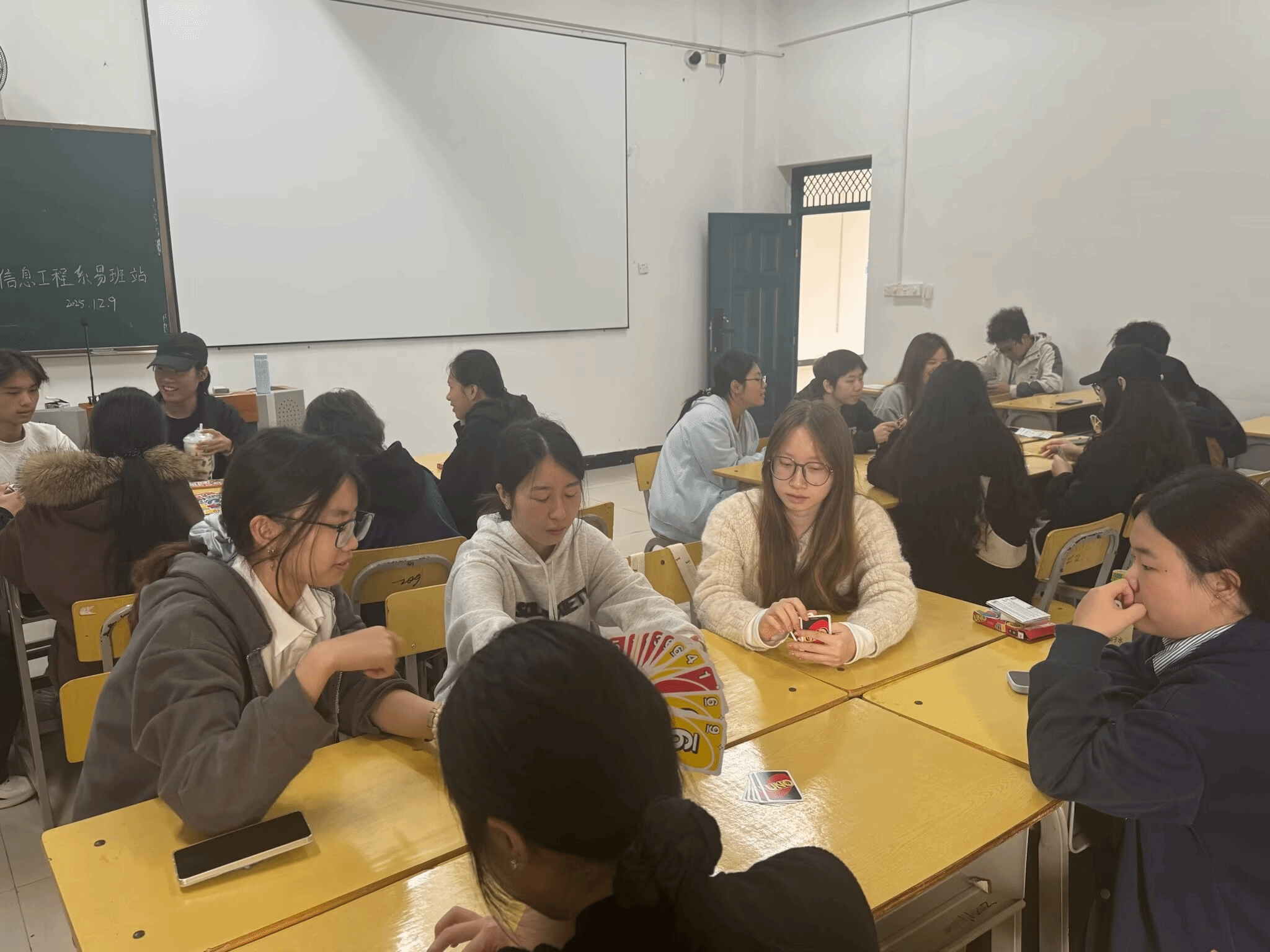 为丰富我系学生的课余文化生活,有效缓解学习压力与生活烦恼,增进同学之间的交流与情谊,12月9日下午,由信息工程系易班工作站主办的“‘信’趣桌游会,欢乐齐加倍”主题UNO桌游活动,在教学楼505教室热闹举行。活动吸引了众多学生踊跃参与,现场气氛轻松活跃,欢声笑语不断。