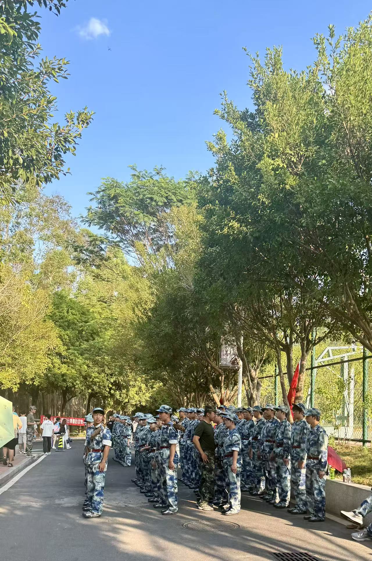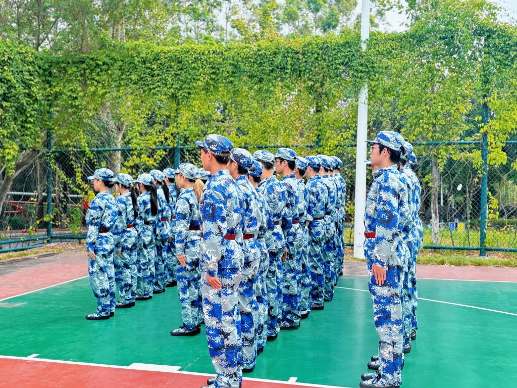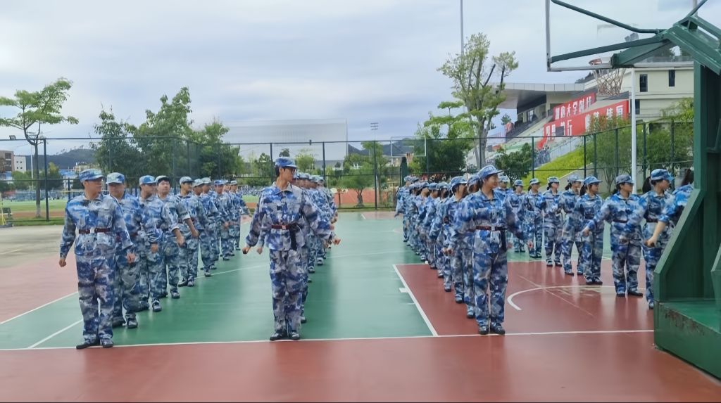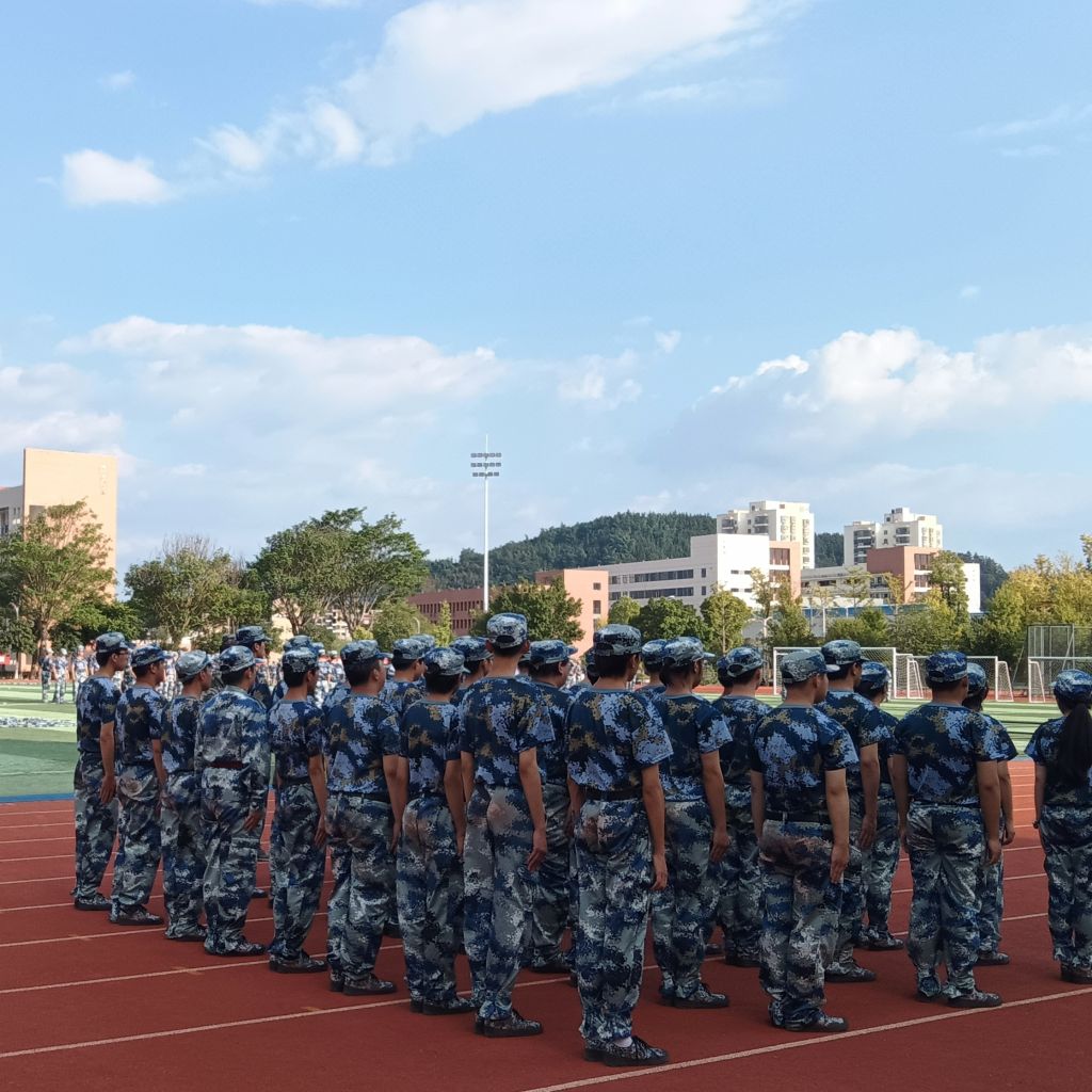 身着蓝白迷彩的学子们在球场列阵,身姿挺拔如松。他们以整齐的队列诠释军训的纪律性,在绿意环绕中迈出青春正步,于汗水与坚持里锻造担当,书写校园军训中关于集体与成长的铿锵篇章。