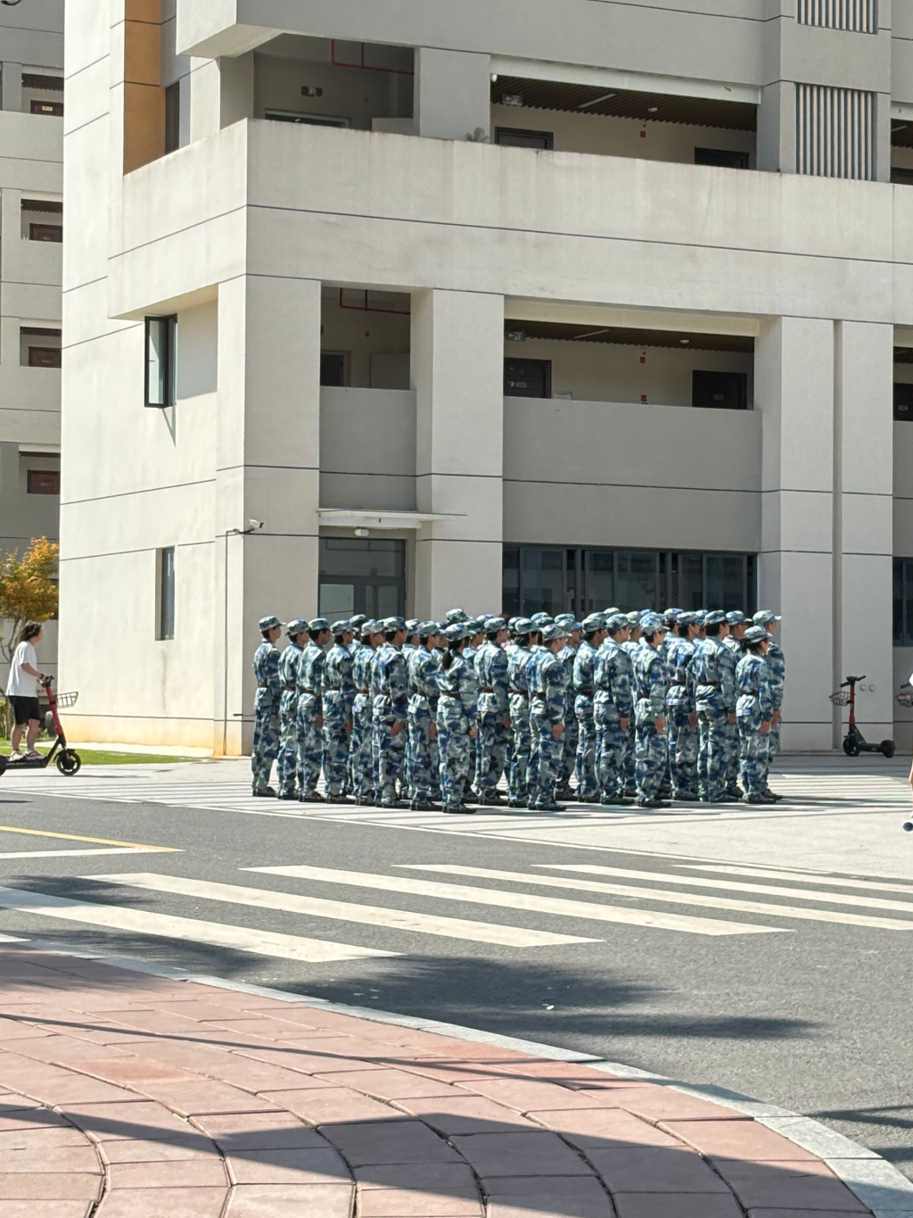 阳光下,蓝白迷彩的队列如青松般挺立在校园路口,身后的灰白教学楼简约大气。这是新生们的军训时刻,汗水在青春脸庞闪烁,每一个摆臂、每一次立正都在书写成长。旁边的滑板车、路过的行人,让这严肃的训练场景多了几分校园的灵动,是朝气,是蜕变,更是青春最燃的模样。