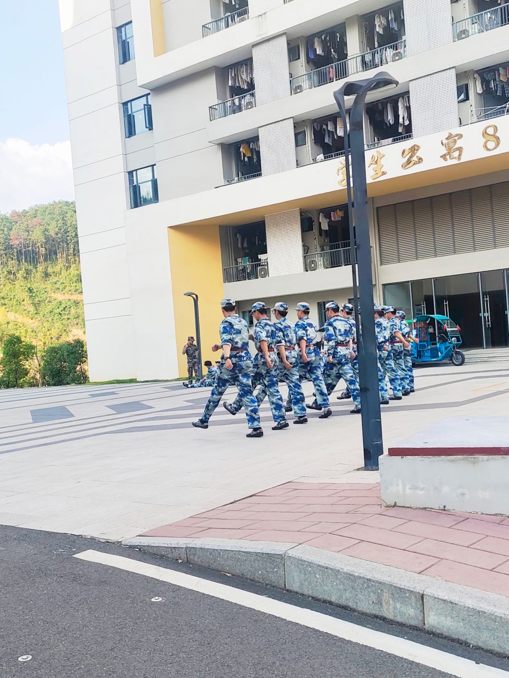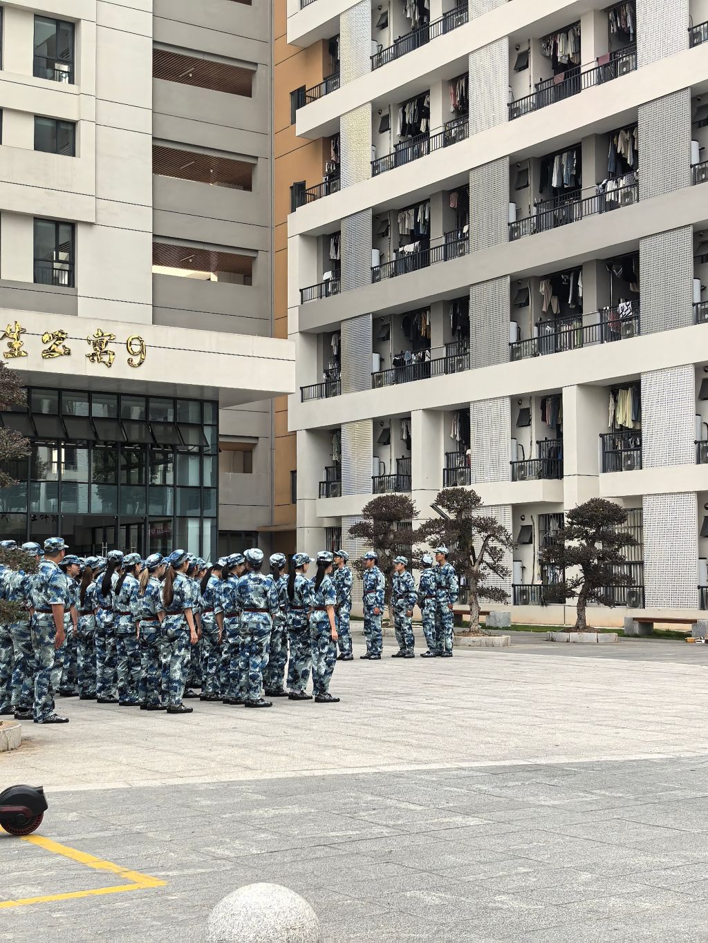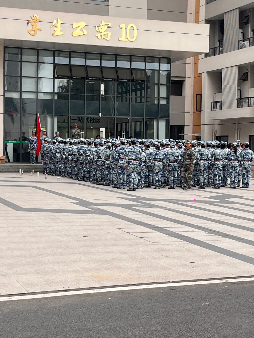 在学生公寓10前,一群身着迷彩服的学子整齐列队,身姿挺拔如松。他们眼神坚定,正等待着指令,周身散发着青春的朝气与纪律的严谨。旁边的红旗随风轻扬,与现代化的建筑相映成趣。这不仅是军训场景的定格,更是青春在纪律与规范中磨砺成长的生动写照。