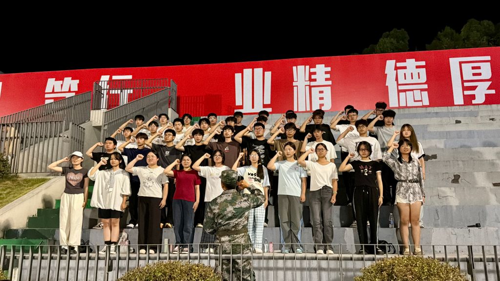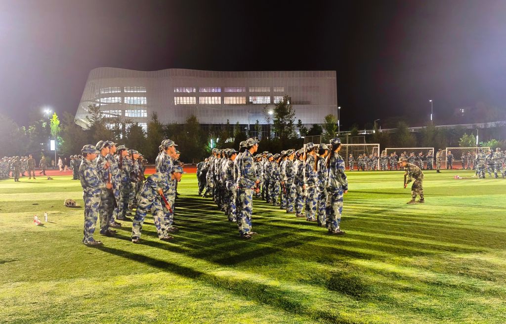 夜晚的校园阶梯上,学生们在教官带领下唱响军歌、庄严宣誓。“明思笃行业精德厚”的标语映衬着他们的朝气,军歌的激昂与誓言的坚定,展现出青春学子在军训中磨砺意志、践行担当的动人图景。