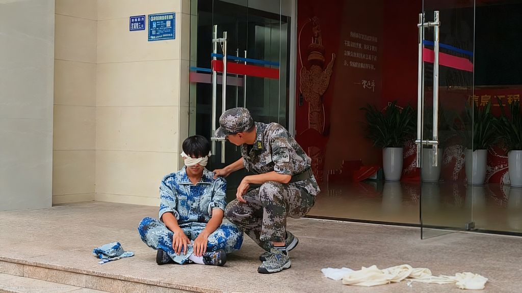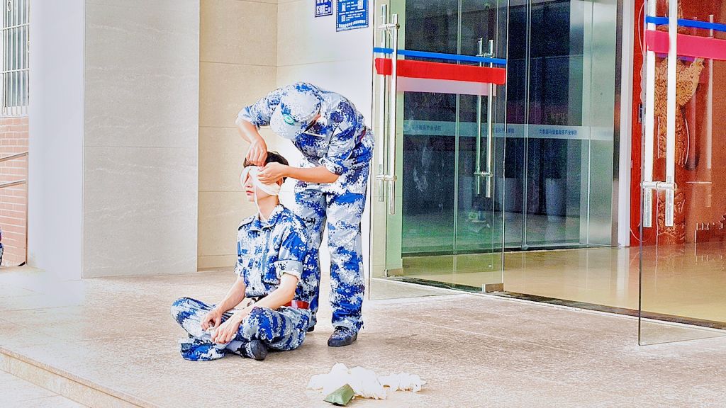 班身着迷彩服的学生正在接受眼部包扎,医护者神情专注,动作轻柔。迷彩的坚毅与白衣的温柔相映,展现了训练场上的别样守护。它不仅记录了军训的严格,更传递出关怀与担当——每一次跌倒与受伤,都有无声的守护在身旁。