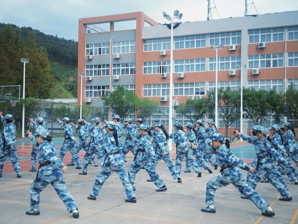 操场上,同学们穿着整齐校服练匕首操。大家手持匕首,动作刚劲利落,刺、劈、收招一气呵成。队列整齐划一,踏步声铿锵有力,少年们神情专注,尽显青春活力与蓬勃朝气。