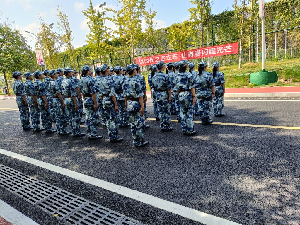 校园道路上,身着迷彩服的学子整齐列队,似待发的蓬勃力量。阳光、绿树相伴,这是青春与纪律的美好邂逅,开启大学成长新篇。