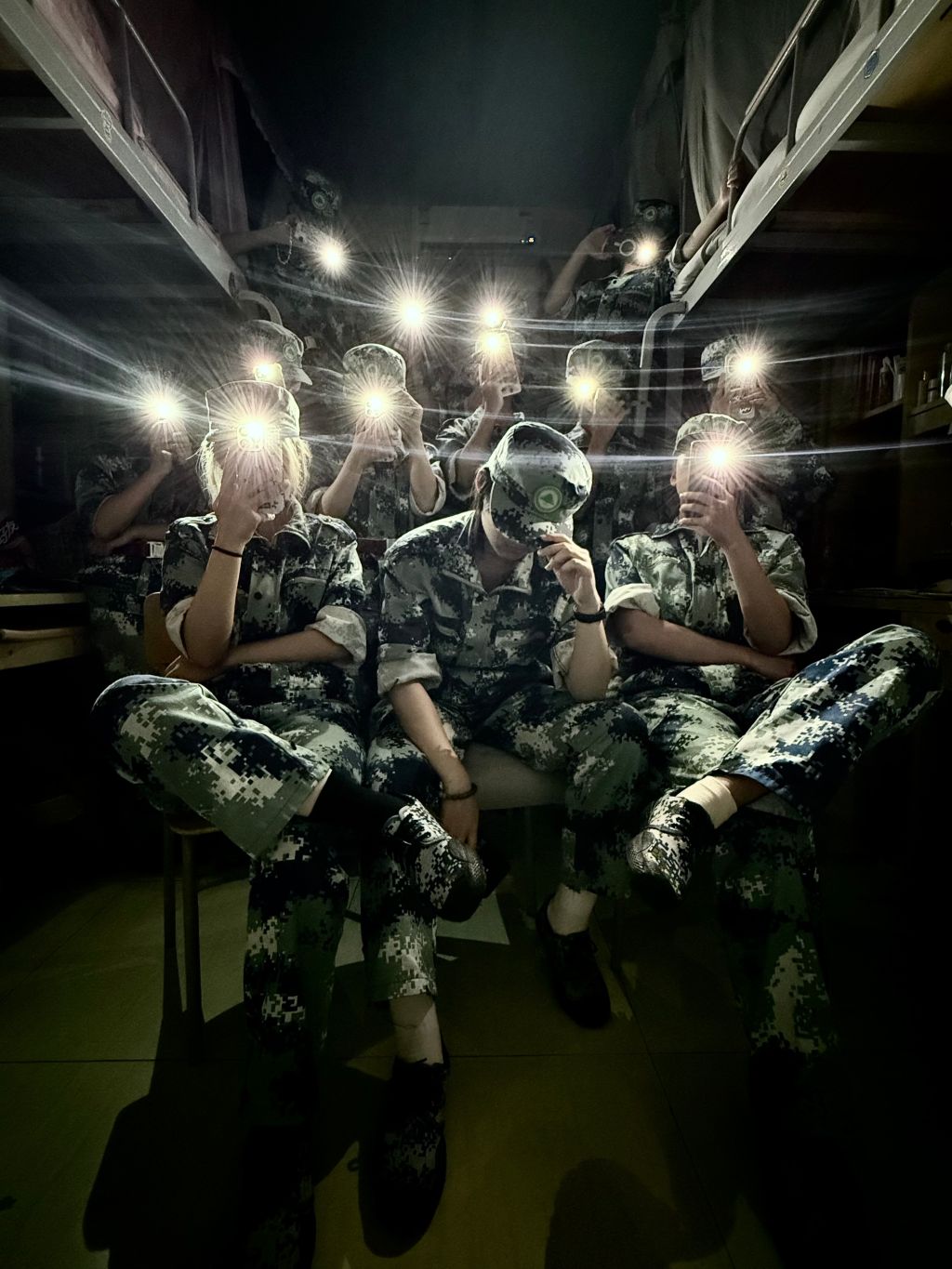 这组作品聚焦于大学军训期间的宿舍场景,以手机闪光灯营造出独特的光影氛围。身着迷彩服的学子或坐或站,昏暗空间里的闪光如星芒闪烁,既展现了军训生活的青春气息,又通过创意构图与光影运用,定格了那段充满朝气与集体记忆的时光,是青春与创意碰撞的生动记录。