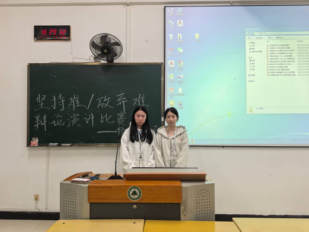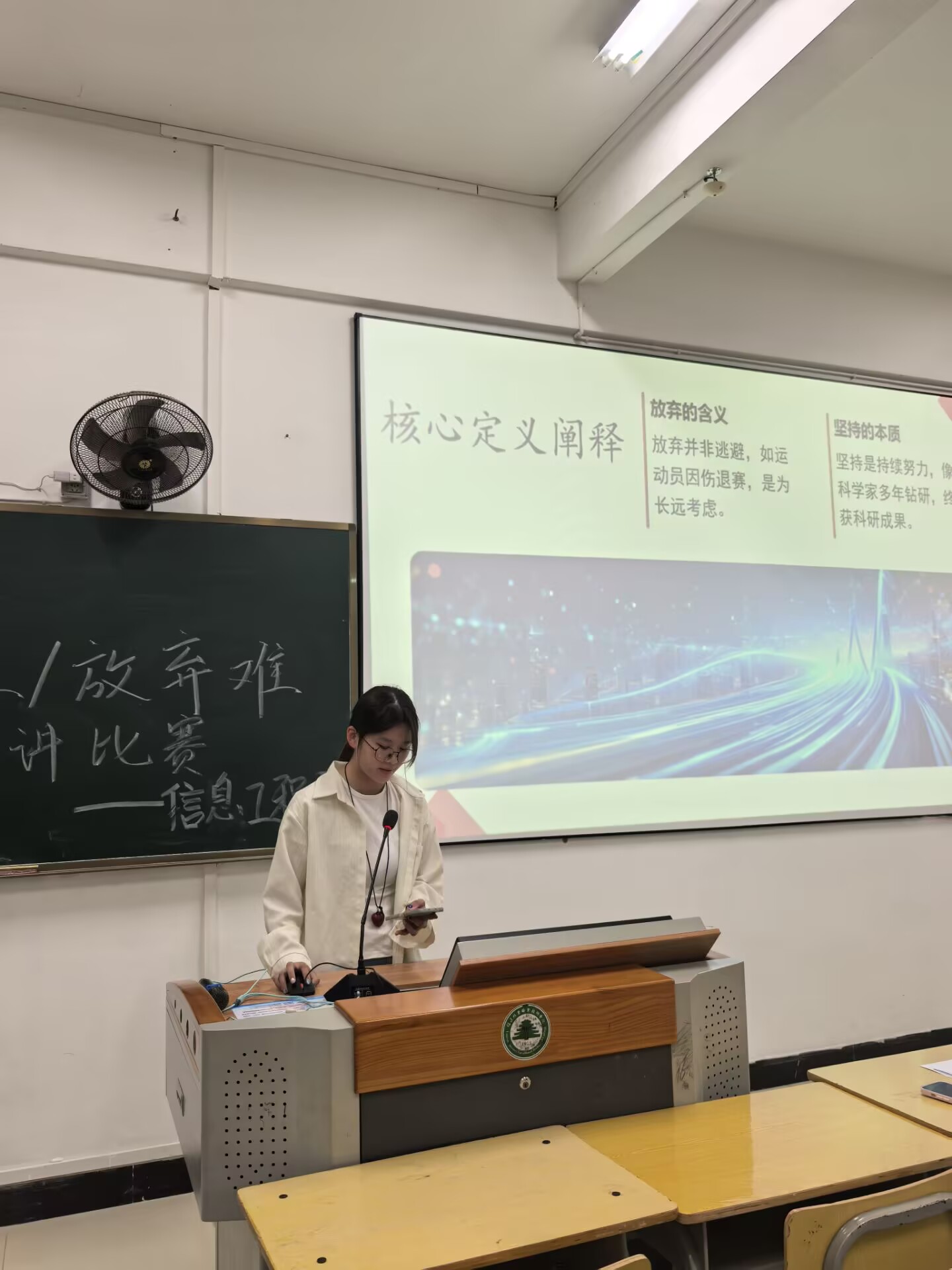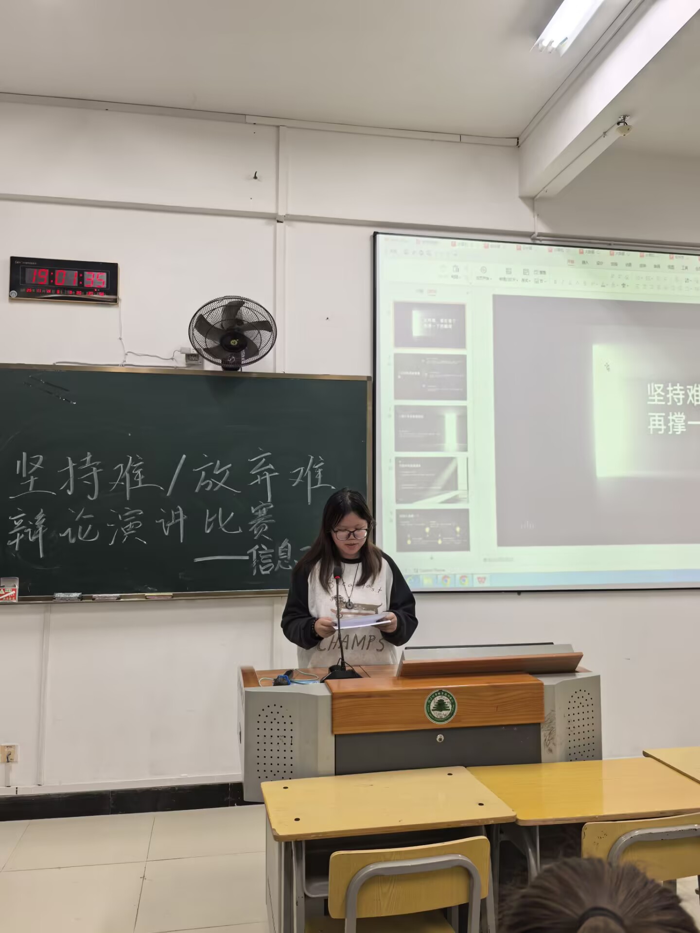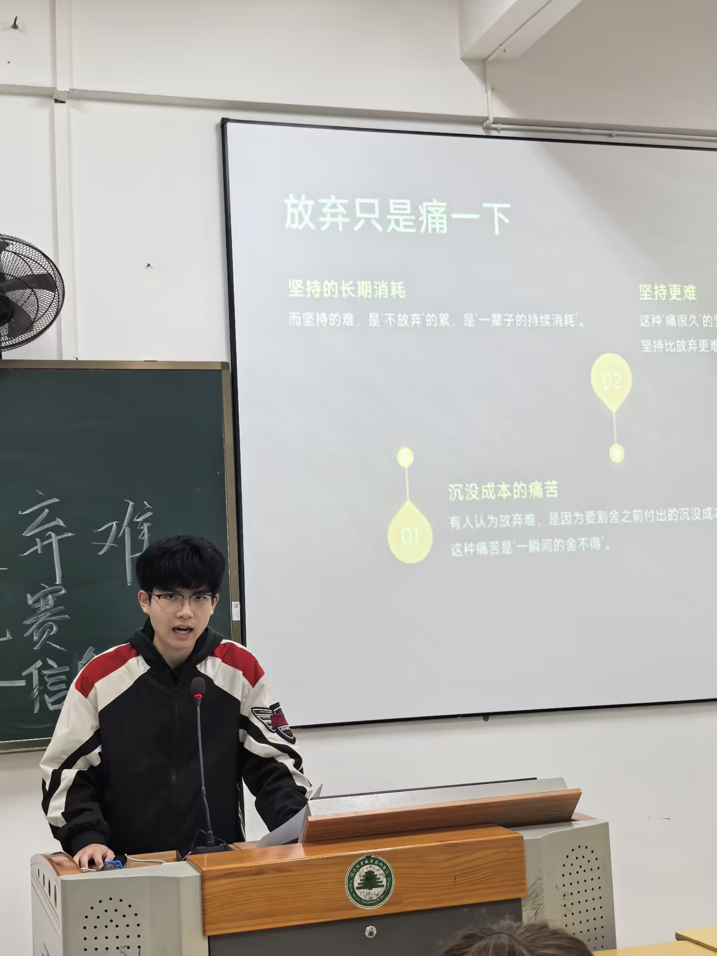 比赛现场氛围热烈,参赛选手以精心制作的PPT为辅助,围绕“坚持难”与“放弃难”两大辩题展开深度阐述。支持“坚持难”的选手,结合求学路上的攻坚经历、行业前辈的坚守故事,剖析长期坚守背后的毅力考验与未知挑战;主张“放弃难”的选手,则从情感羁绊、沉没成本、责任担当等角度切入,讲述取舍之间的内心挣扎与勇气考验。选手们言辞恳切、逻辑清晰,PPT 画面与演讲内容紧密呼应,既有理性的逻辑推演,又有感性的情感共鸣,精彩发言赢得现场观众阵阵掌声。