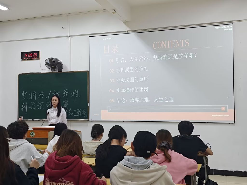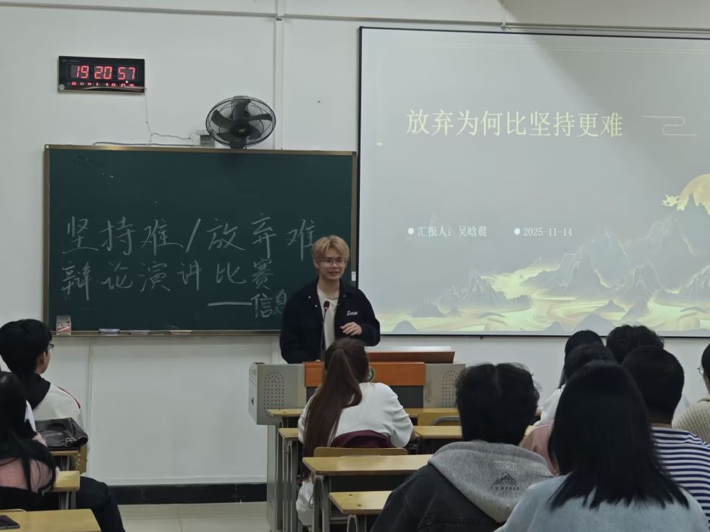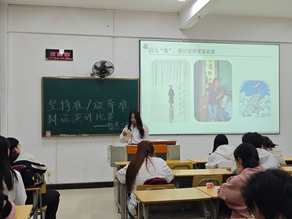 为丰富校园文化生活,搭建学子思想碰撞与语言表达的展示平台,锤炼逻辑思辨能力与临场应变素养,信息工程系于2025年11月11日14:30,在教学楼405教室成功举办“坚持难/放弃难”辩论主题演讲比赛。全系学子踊跃参与,用语言交锋观点,用思考诠释青春态度。