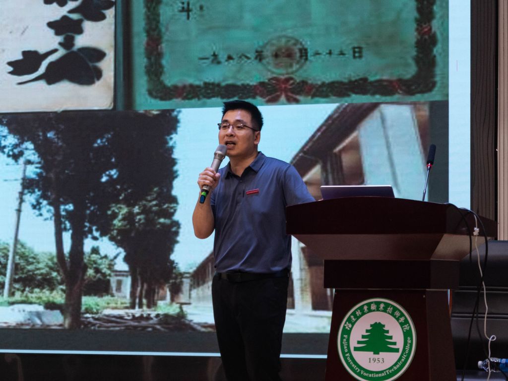 在“校史系情”环节,华书记以时间为脉络,带领新生回溯学院的奋斗历程:从1953年福州北园建校,到2003年升格为“福建林业职业技术学院”的跨越,再到如今建设花园式校园的成就。他借助一幅幅承载岁月记忆的老照片、一段段见证发展的里程碑事件,生动再现了林职人在闽北山区“拓荒创业”的艰辛——如何将一片荒坡变为如今绿树成荫的校园,如何坚守“以技载道、树木树人”的办学理念,让“敬业、吃苦、务实、进取”的天麟精神代代相传。