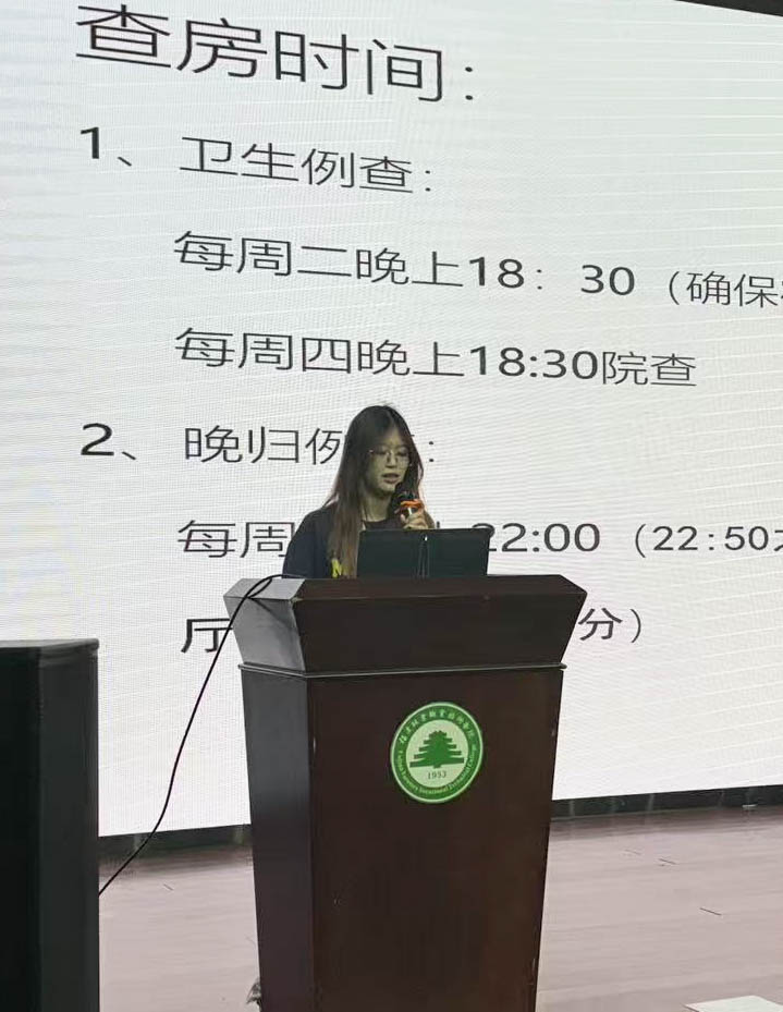 文娱口副主席欧钰在此次宿舍长大会上进行总结发言,她着重强调,宿舍管理工作的有序推进离不开各部门的协同配合,希望各部长切实履行职责,发挥好带头引领作用,将宿舍安全、文明建设等工作细化落实到每一个环节,加强与宿舍长的日常沟通对接,及时反馈并解决宿舍管理中出现的问题,形成工作合力。