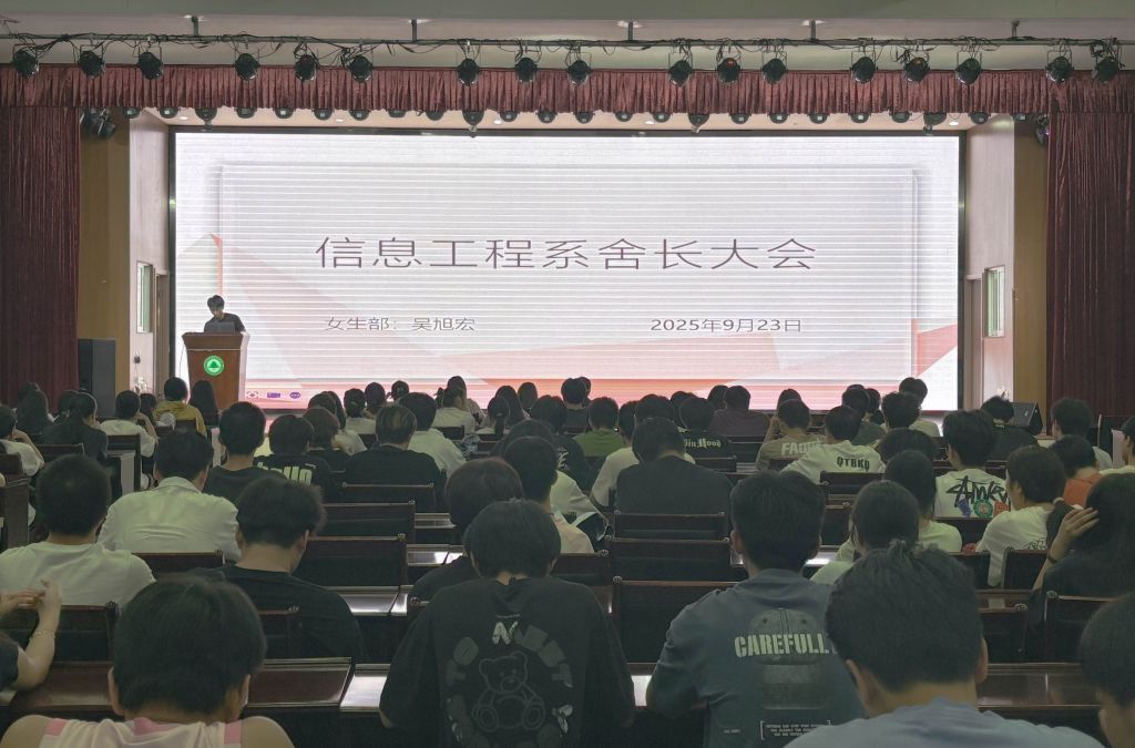 为进一步规范宿舍管理,明确宿舍长工作职责,切实保障全体在校学生的住宿安全与生活秩序,信息工程系于2025年9月23日下午15时在江南礼堂召开宿舍长大会。我系全体在校宿舍长参会,会议由文娱口副主席欧钰、女生部部长吴旭宏、宿管部部长杨淏钧、纪检部部长李然、保卫部部长黄汉清共同主讲。