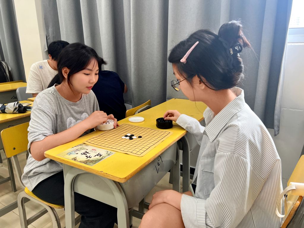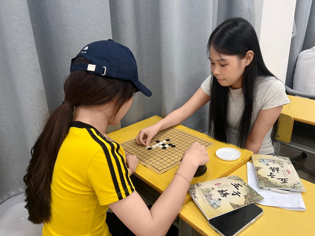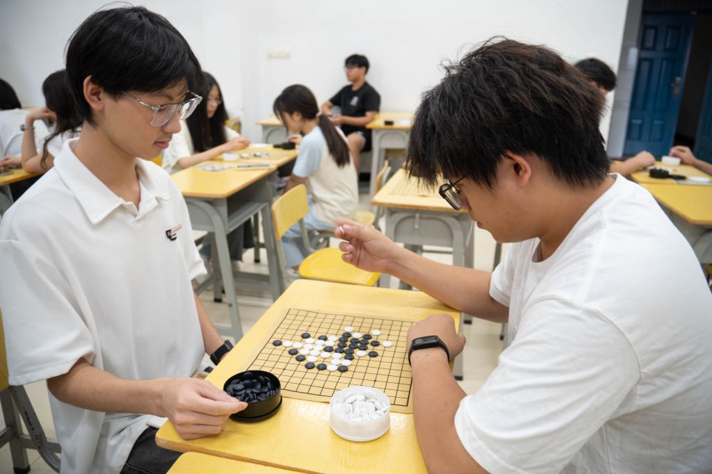 随着赛事负责人宣布“比赛开始”,原本热闹的教室迅速切换至“专注模式”:选手们或两两对坐,在双人对局中展开一对一的思维较量;或三五成组,在团体对弈里磨合协作策略。棋盘上,黑子落定如稳扎营盘,白子穿插似巧破阵局,清脆的“嗒嗒”落子声成为赛场的主旋律。有的选手托腮凝思,指尖在棋盘边缘轻叩,反复推演多种走法;有的选手果断出击,以一步“冲四活三”的妙棋扭转局势;旁观的同学也屏息凝神,在不打扰对局的前提下,默默为选手的精彩思路点头称赞。整场比赛节奏紧凑却秩序井然,每一局对弈都充满策略与趣味的碰撞,尽显青春学子的思辨活力。