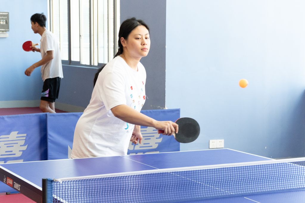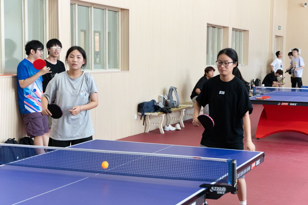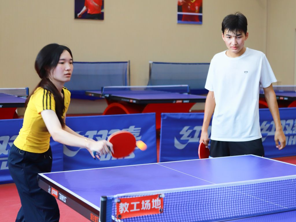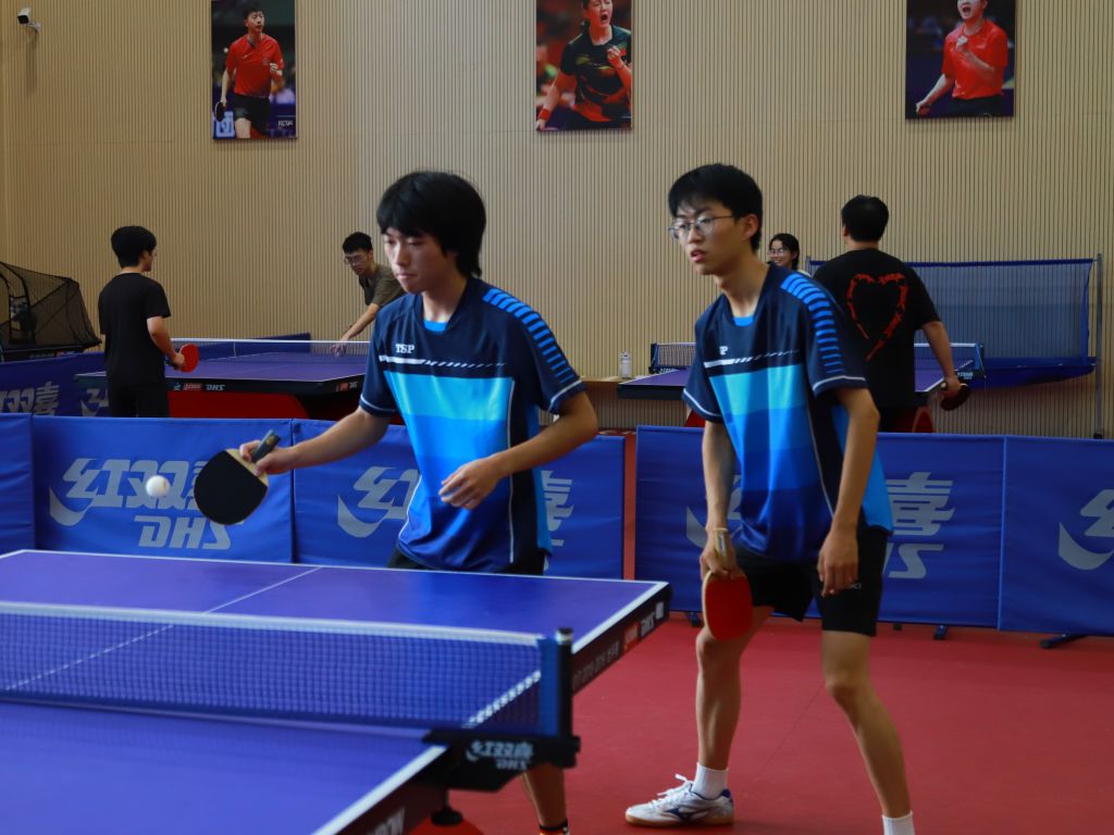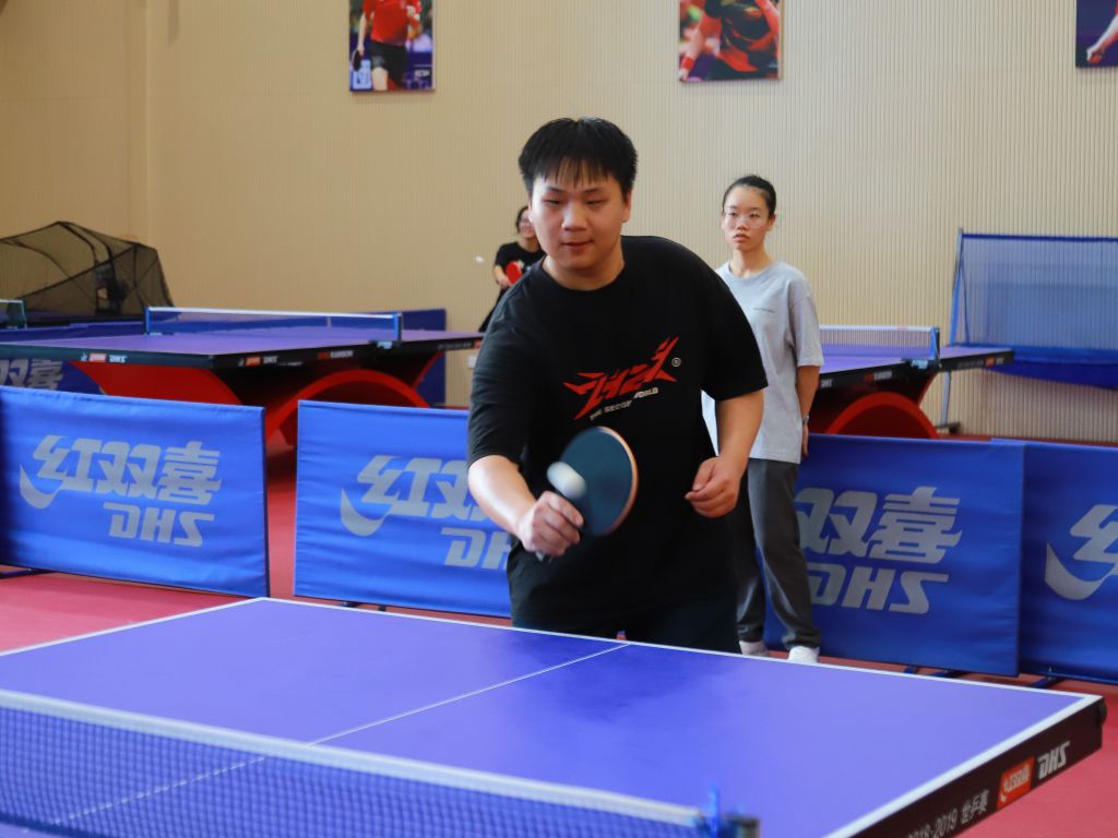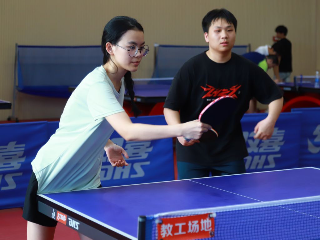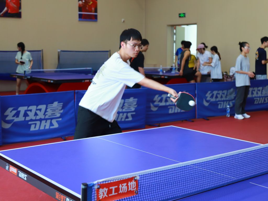 本次比赛设置男单、女单、男双、女双及混双五大组别,既为学子提供了展示个人球技的舞台,也搭建了团队协作交流的平台。随着哨声响起,赛场瞬间进入“高能模式”:银球在蓝色球台上来回穿梭,选手们凝神专注、步伐灵动——正手爆冲势大力沉,反手快撕精准刁钻,侧旋发球变幻莫测,每一次挥拍都凝聚着力量与技巧,每一次攻防都充满紧张与精彩。观众席上不时响起阵阵喝彩,为选手的精彩表现助威。