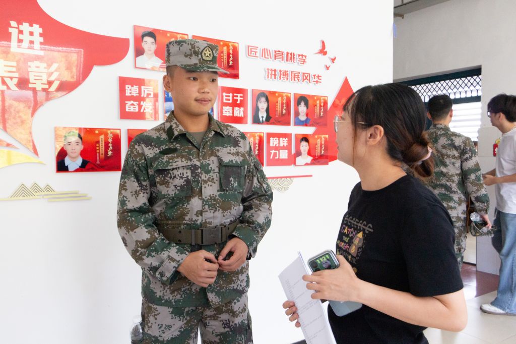 图为范秋叶辅导员与新生教官谈话