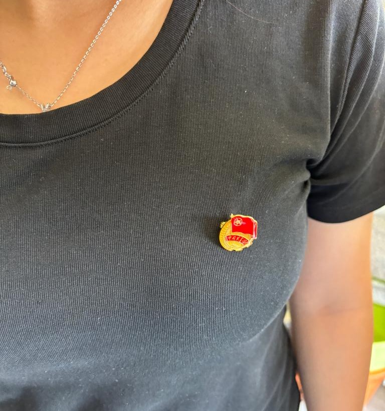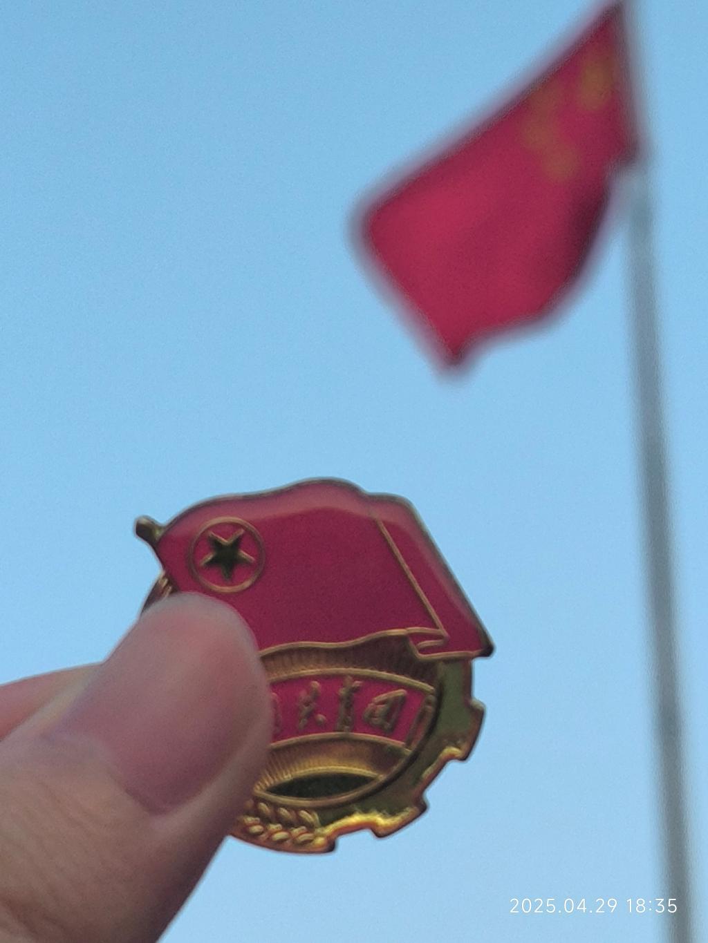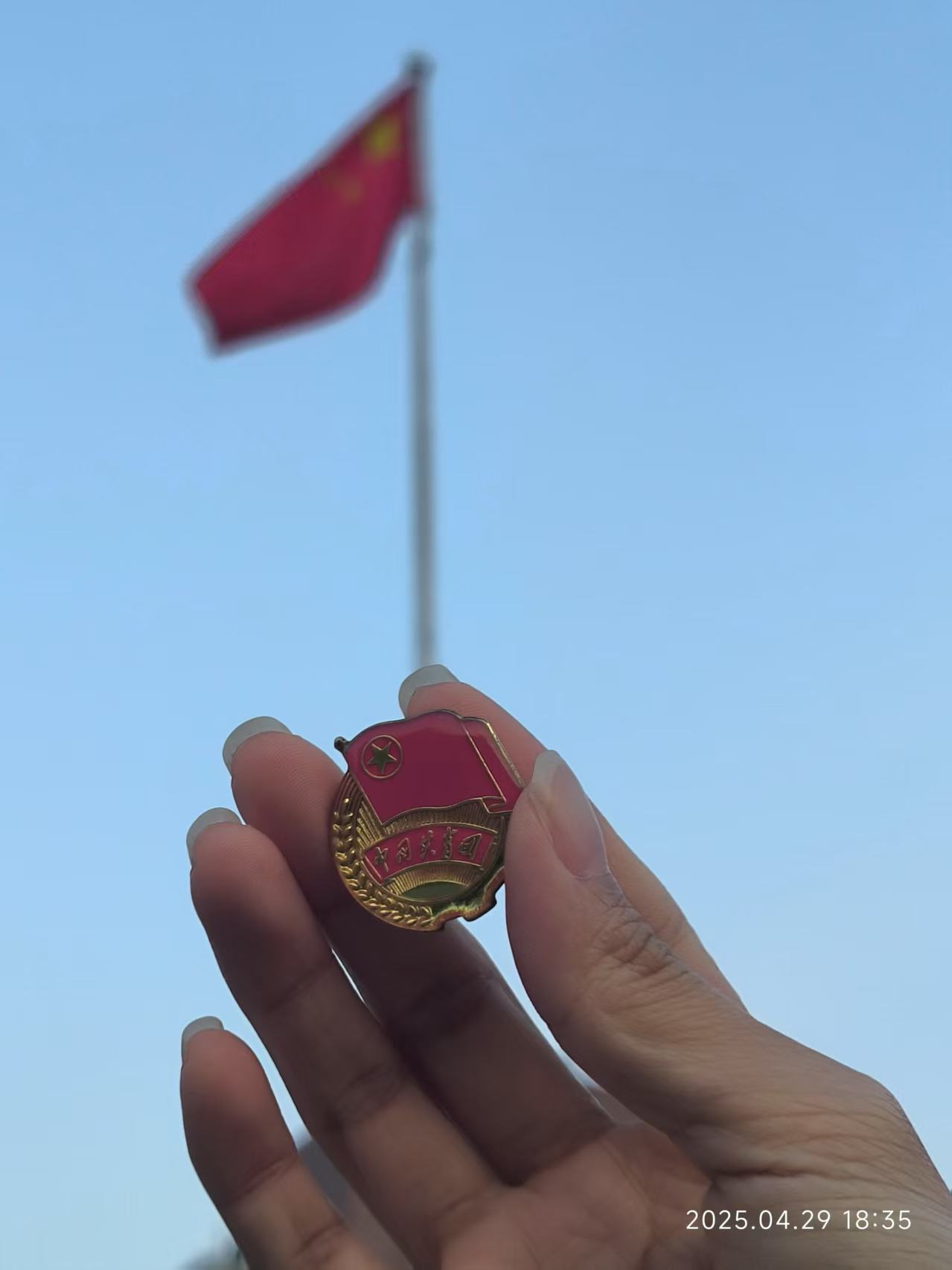 在这张照片里,我与熠熠生辉的团徽同框。团徽,是中国共青团的标志性符号,红旗、五角星、齿轮麦穗,组合成庄严而神圣的形象,承载着共青团的光辉历史与使命。与团徽合影,于我而言意义非凡。它象征着我对共青团精神的敬仰与追随,激励我牢记初心,在新时代浪潮中,以奋斗为笔,以担当为墨,书写属于青年的华章,让青春在奉献中绽放光彩。