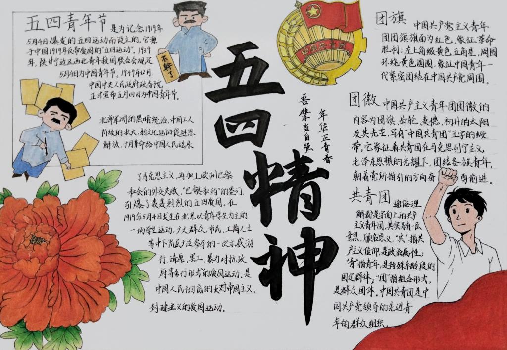 1919年,五四青年高举爱国旗帜,以热血与勇气掀起反帝反封建浪潮,铸就“爱国、进步、民主、科学”的五四精神。飘扬的团旗以红色彰显革命传承,黄色五角星与圆环象征青年紧密团结,闪耀的团徽铭刻着共青团的使命担当。百余年来,五四精神薪火相传,新时代青年在团旗团徽指引下,以青春之力投身国家建设,勇担时代使命,让这跨越时空的精神火炬,持续照亮民族复兴之路。