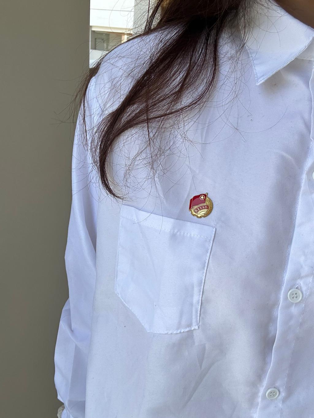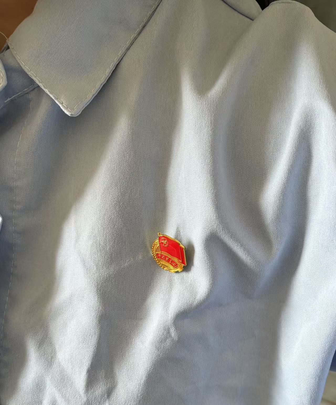 一枚熠熠生辉的团徽端端正正别在纯白衬衫左上方,靠近心脏的位置。银色的齿轮、麦穗环绕着金色光芒下的团旗、火炬与五角星,在素净的底色衬托下愈发醒目庄重。每当微微颔首或迈步前行时,团徽便随之折射出细碎光亮,恰似心中不灭的信仰之火,与洁白衬衫的纯粹相得益彰,既彰显着青春的蓬勃朝气,又无声诉说着新时代青年的使命与担当。