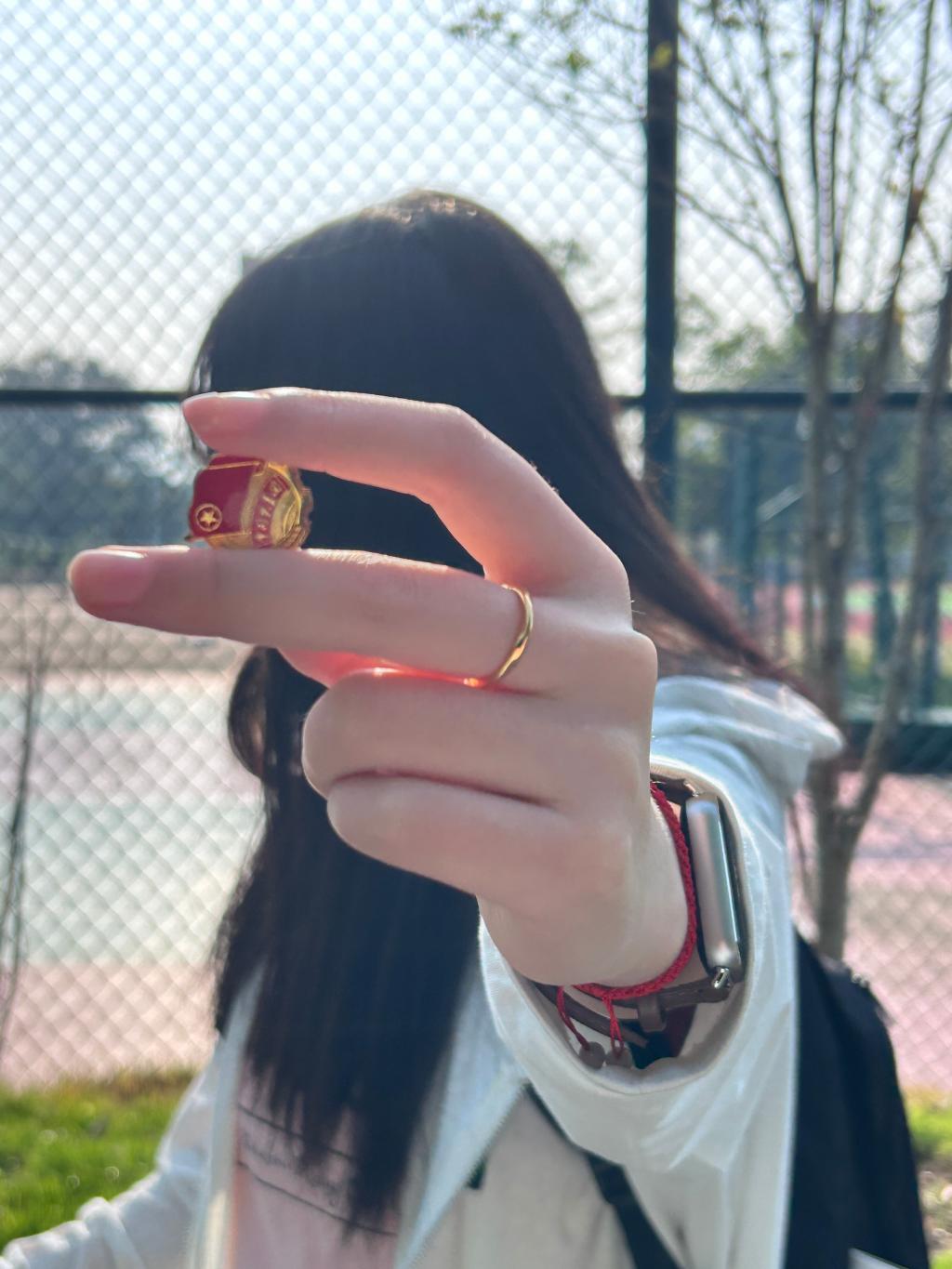 定格最美青春,我与团徽共合影模仿网络上比较热门的“指尖生花”的拍照方式,将团徽夹在指尖,团徽作为主景,人物作为背景。