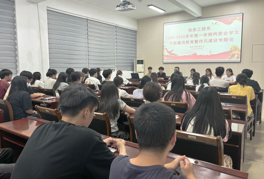 为进一步加强学生干部队伍建设,提高学生干部的廉洁意识、责任意识和服务意识,营造风清气正的校园环境,同时明确新学期两委会各部门工作任务、职责边界与执行要求,信息工程系于2025年9月2日18:30在信工楼408会议室召开2025-2026学年第一学期两委会学生干部廉洁教育暨作风建设专题会。本次会议由学生科长兼团总支书记吴文杰主持,系两委会全体学生干部参会。