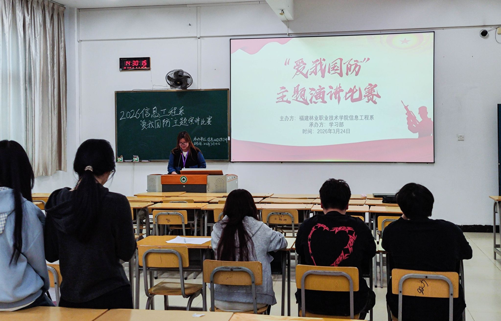 为深化系部国防教育工作,增强大学生国防意识与责任担当,营造关心国防、热爱国防的良好氛围,2026年3月24日,信息工程系在教学楼405举办“爱我国防”主题演讲比赛,活动吸引众多同学踊跃参与。
