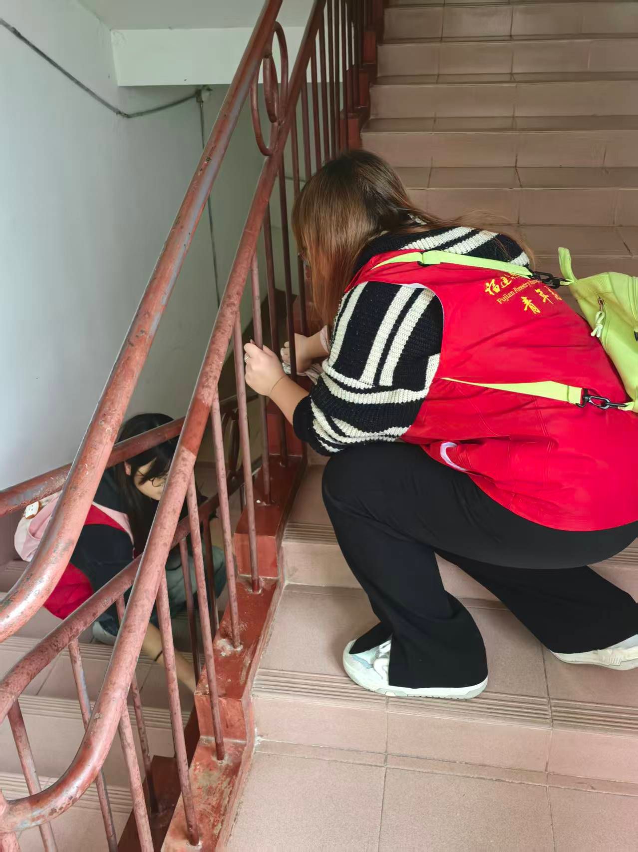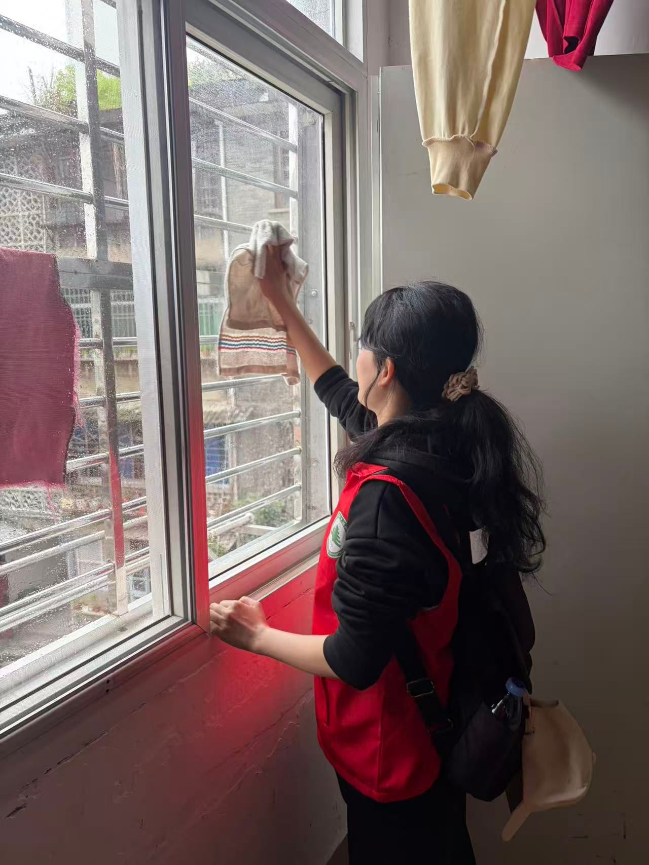 志愿者走进敬老院擦拭楼梯扶手,以细微服务传递敬老温情。