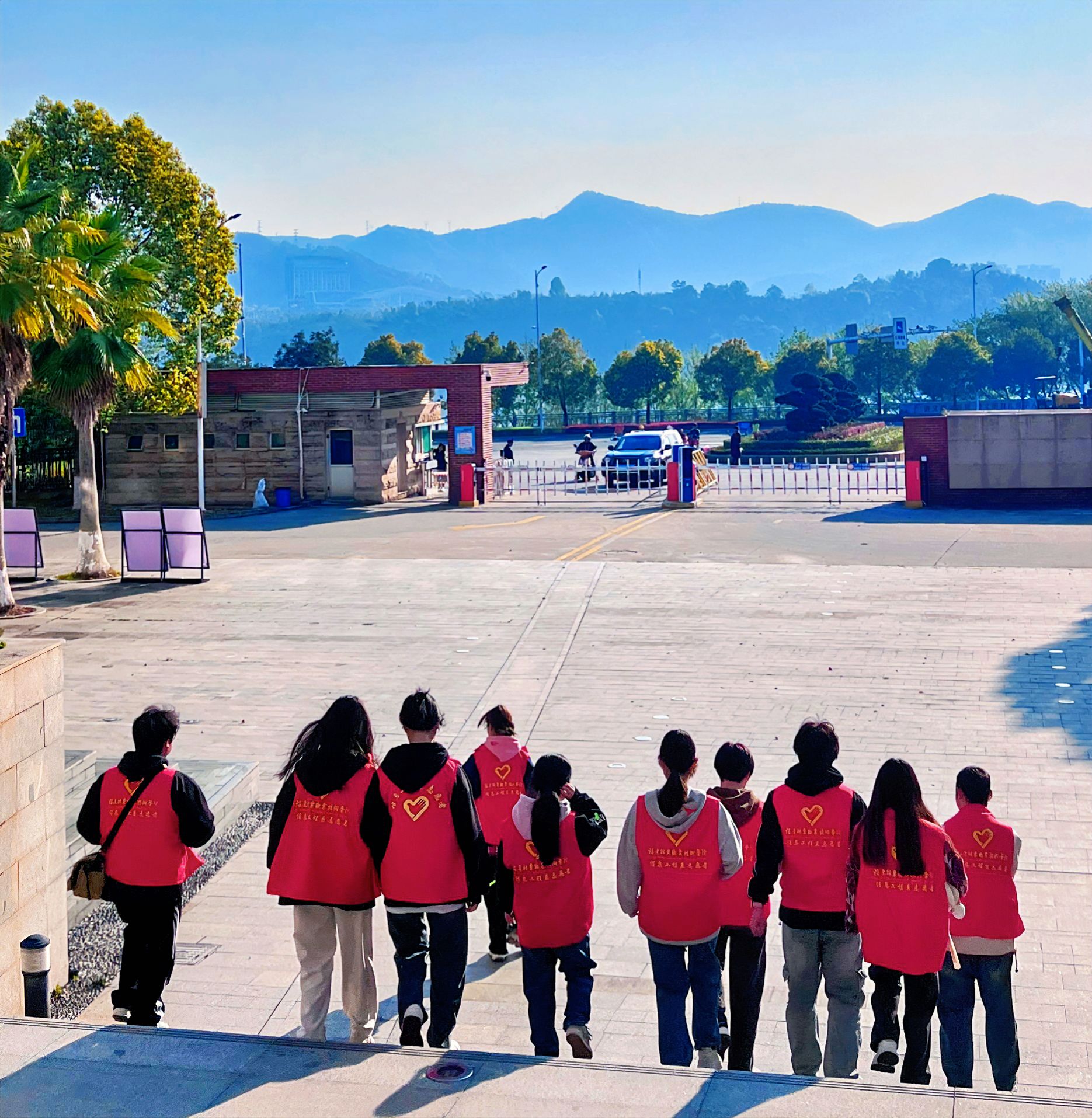 清晨志愿队伍整装出发,志愿红与青山蓝天相映,尽显学子公益热忱。