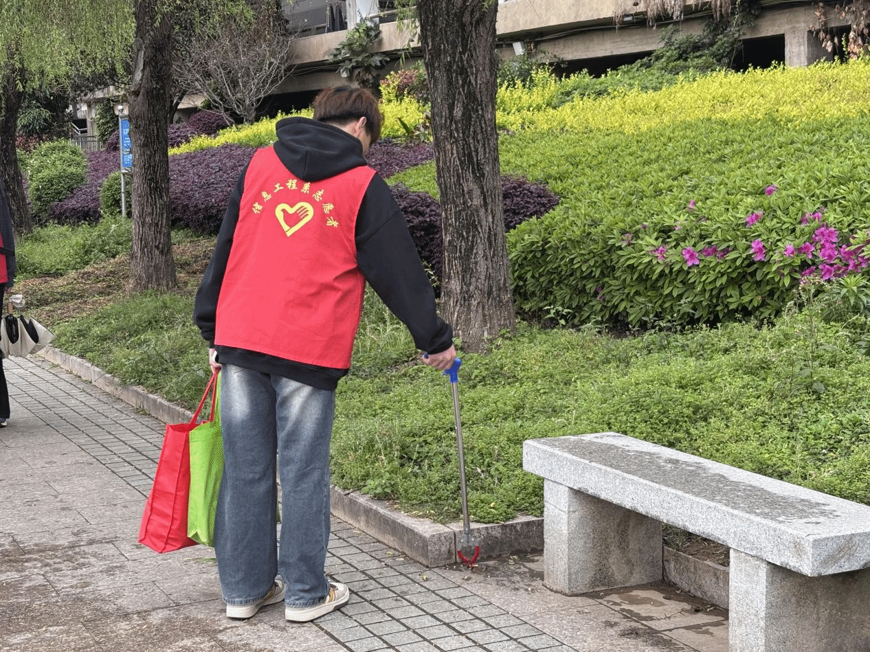 志愿者清理街头绿化带杂物,以青春力量守护城市洁净。