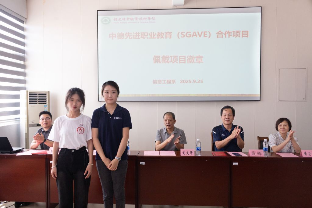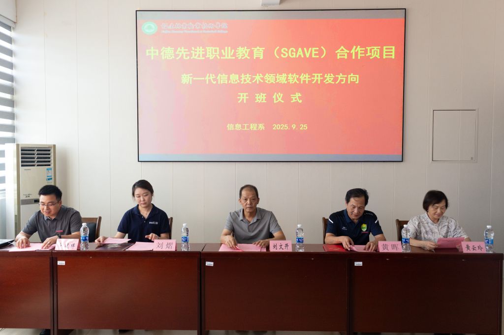 为深入贯彻落实福建省委“三争”行动部署要求,积极在职业教育国际化领域争先进、创佳绩。9月25日下午,2025级软件技术专业中德先进职业教育合作项目(SGAVE)开班仪式在信工楼408会议室举行。学院党委副书记、院长刘文开,副院长黄晖,教务处处长黄云玲,德中睿智互联网技术(上海)有限公司总经理刘熠、部门经理杨亚君、项目经理李涵,信息工程系党政班子成员,相关专业教研室主任、辅导员及SGAVE项目试点班全体学生共计50余人参加开班仪式。开班仪式由信息工程系党总支书记、系主任华建祥主持。
