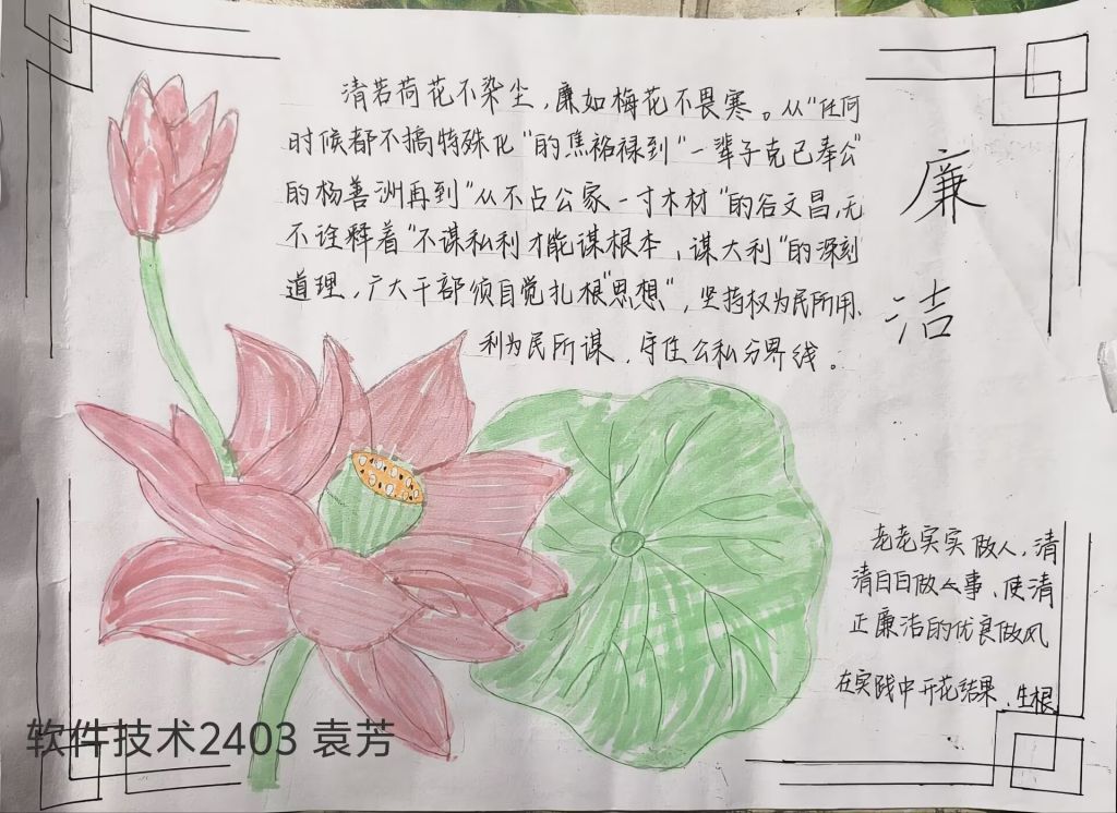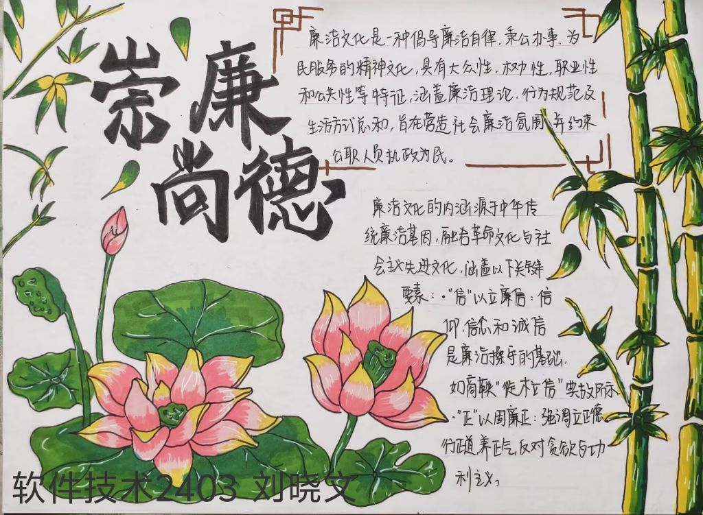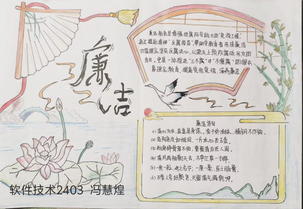 课后,同学们用手抄报诠释对廉洁的理解与坚守,一张张作品中,有对廉洁内涵的阐释,有对榜样力量的敬仰,更有从我做起践行廉洁的坚定决心。以下为部分同学的优秀手抄报作品展示: