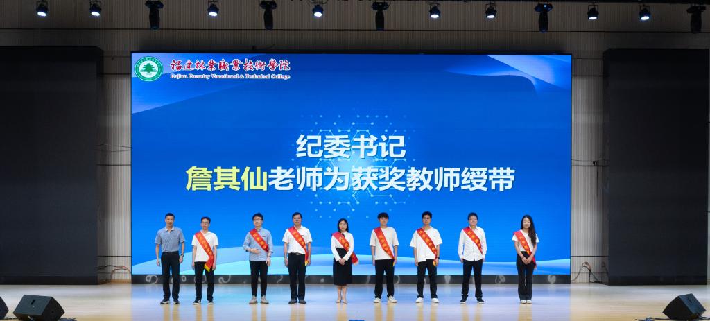 由纪委书记詹其仙老师为省赛获奖指导老师绶带。