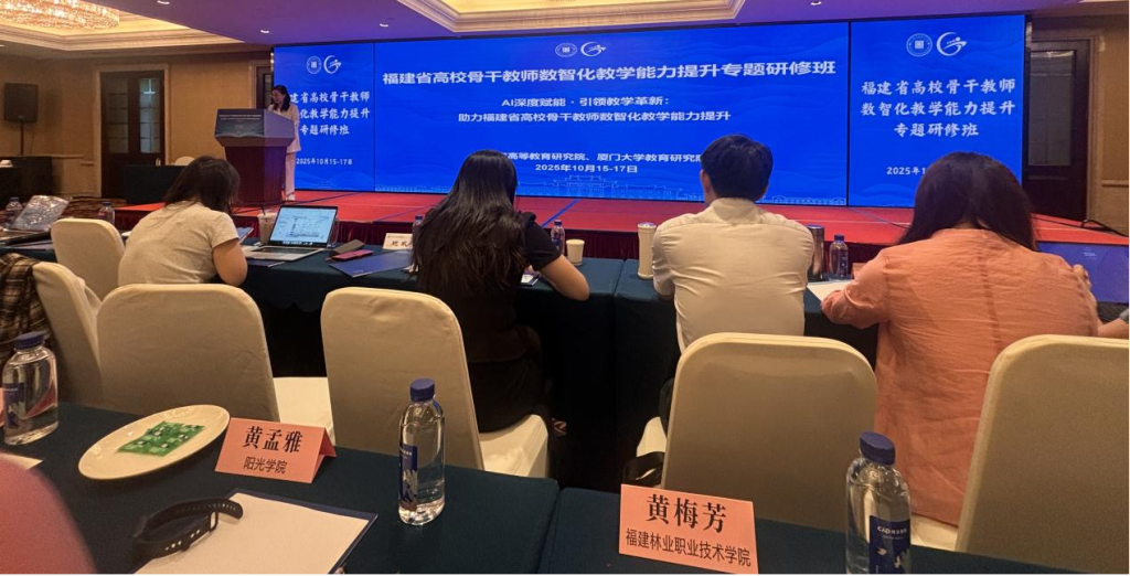 为聚焦AI技术赋能教学,提升教师教学综合素养和教学关键能力,信息工程系安排教师黄梅芳于10月15日至17日参加福建省高等教育研究院、厦门大学教育研究院举办的福建省高校骨干教师数智化教学能力提升专题研修。研修班以“AI深度赋能・引领教学革新:助力福建省高校骨干教师数智化教学能力提升”为主题,聚焦人工智能在教学全流程的深度应用,系统覆盖AI工具应用、教学资源创建、课堂理念革新等关键领域,为教师提升数智化教学综合能力。