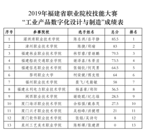 由福建省教育厅主办的“2019年福建省高职院校大学生工业产品数字化设计与制造技能大赛”于2018年12月15至16日在湄洲湾职业技术学院举行。本次比赛参赛的队员为数控1608曾继鹏、模具1605林哲睿2位同学。参赛的队员在老师精心指导下,不畏强敌,沉着应战,战胜了众多强队,获省级二等奖。
