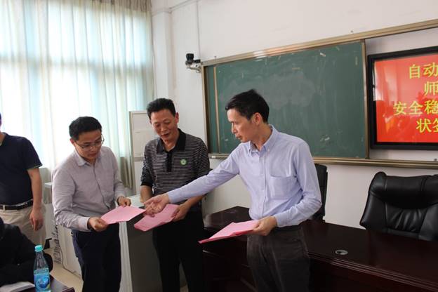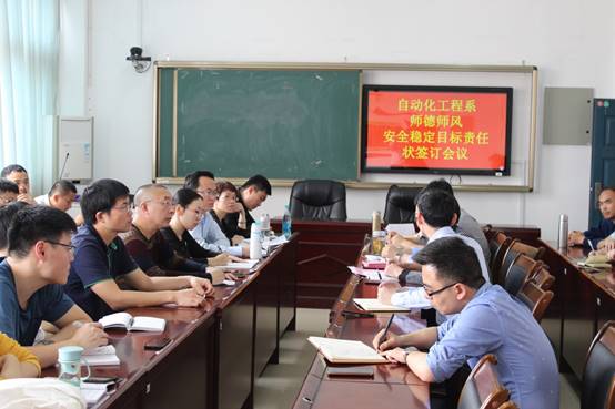 为深入贯彻习近平新时代中国特色社会主义思想和党的十九大精神,进一步加强师德师风建设,强化校园安全稳定管理,4月28日下午2点30分,自动化工程系于实训三408会议室召开师德师风与安全稳定目标责任书签订会议,全体教职工参会。会议由系党总支书记吴奇镇主持。