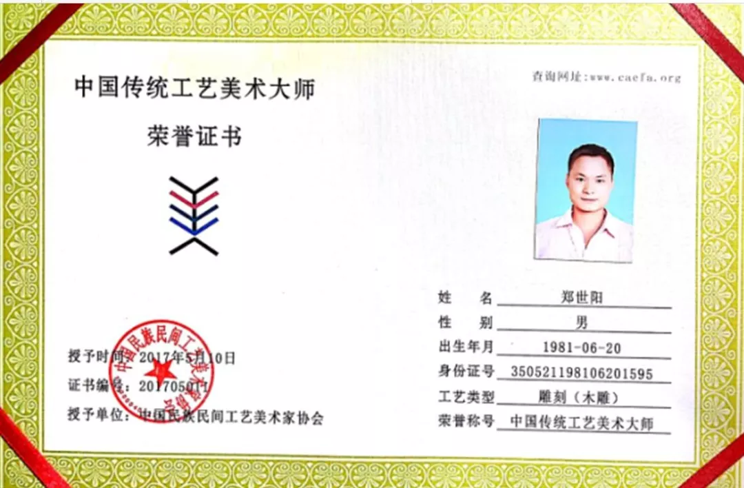 郑世阳,毕业于福建师范大学艺术设计系,南平市延平区世阳雕刻制品有限公司负责人。现为福建根雕艺术大师、中国传统工艺美术大师,是中国工艺美术协会中青委委员、福建省工艺美术协会会员、南平市工艺美术协会会员。曾拜中国工艺美术大师贺耀辉为师,先后参加中央文化管理干部学院“吴笠谷雕刻艺术高级研修班”、福建师范大学“非物质文化遗产继承人高级研修班”、清华大学“文化创意产业高级研修班”、华侨大学“一带一路(泉州)工艺美术创新发展高级研修班”学习进修。现受聘为福建省南平市木根雕品鉴专家玉石品鉴专家。其代表性作品《苏武牧羊》获得第二届中国(大连)国际文化产业博览会工艺美术优秀作品“文博杯”铜奖,并入选《中国当代民间工艺名家名作选粹》第二卷;《夜游赤壁》获得青岛《青艺杯》优秀奖;《名垂青史》获得首届莆田艺雕杯现场赛全省第七名;《代代福报》获得首届中国檀香雕刻艺术创作大赛银奖;《醉千年》获得首届中国檀香雕刻艺术创作大赛优秀奖。2017年获得全国红木现场雕刻全国总决赛“工匠之星”,2018年5月福建省红色题材文化现场雕刻大赛第二名。